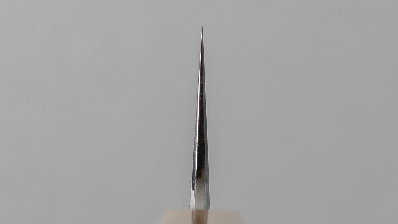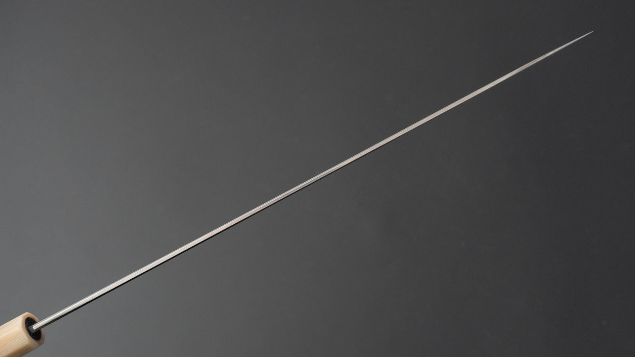 The Japanese slicer. A more specific knife shape ideal for portioning, trimming and finely slicing large cuts of meat, roasts, poultry or fish. The long and thin shape greatly reduces drag and is ideal to make long drawing cuts to thinly slice protein with high precision.
