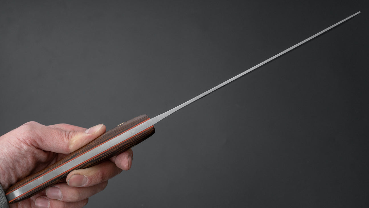 De messen van Jiro-san zijn de meest bijzondere die we in de winkel hebben. Ze belichamen het traditionele vakmanschap waar Japan zo bekend om staat en vertegenwoordigen het toppunt van kwaliteit. Door de grote vraag naar zijn werk kan het een uitdaging zijn om er een te bemachtigen. Uit respect voor de kwaliteit en de vakman doen we er altijd alles aan om ervoor te zorgen dat elk mes een geschikte bestemming vindt. We willen dat deze messen tientallen jaren gebruikt en gekoesterd worden, in plaats van dat ze worden doorverkocht door iemand die alleen maar op zoek is naar snelle winst.