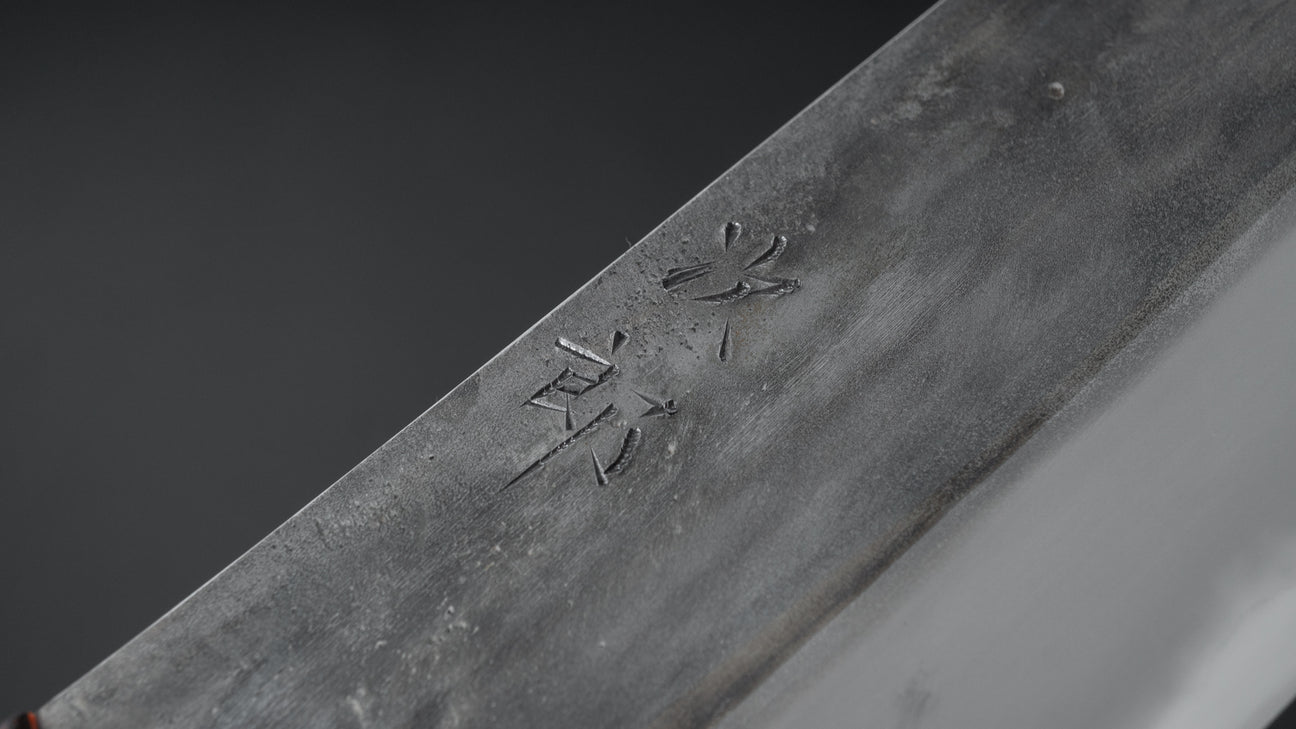Zijn messen zijn gemaakt van Shirogami No.1 koolstofstaal, een van de zuiverste koolstofstaalsoorten die in de moderne messenmakerij worden gebruikt. Jiro-san neemt het smeedlassen zelf voor zijn rekening en combineert vakkundig de hardere kern met de zachtere ijzeren bekleding. Door het hele proces in eigen beheer te houden, heeft hij volledige controle over elk detail, waardoor hij elk mes op de ideale temperatuur kan smeden. Het is zeldzaam om messen te vinden die gemaakt zijn zonder voorgelamineerd staal, maar Jiro-sans messen hebben een dikke rug die alleen te bereiken is door zijn toegewijde vakmanschap.