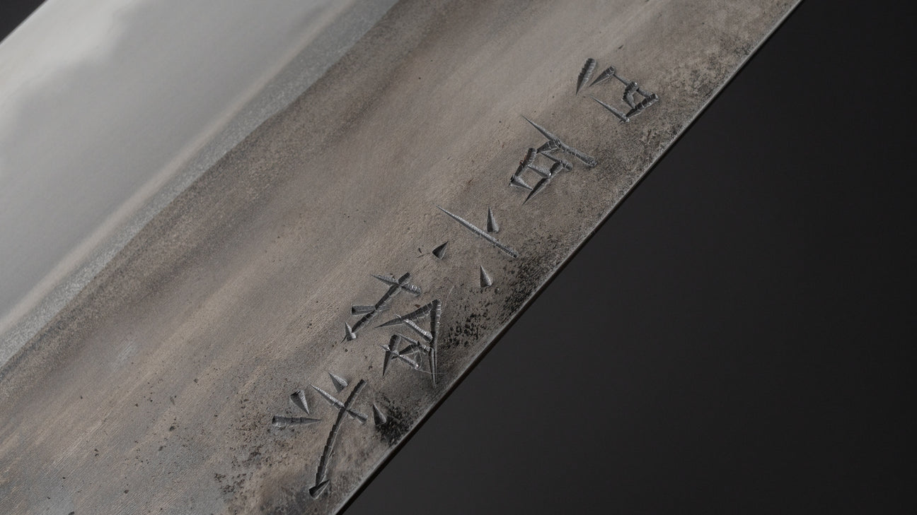 Zijn messen zijn gemaakt van Shirogami No.1 koolstofstaal, een van de zuiverste koolstofstaalsoorten die in de moderne messenmakerij worden gebruikt. Jiro-san neemt het smeedlassen zelf voor zijn rekening en combineert vakkundig de hardere kern met de zachtere ijzeren bekleding. Door het hele proces in eigen beheer te houden, heeft hij volledige controle over elk detail, waardoor hij elk mes op de ideale temperatuur kan smeden. Het is zeldzaam om messen te vinden die gemaakt zijn zonder voorgelamineerd staal, maar Jiro-sans messen hebben een dikke rug die alleen te bereiken is door zijn toegewijde vakmanschap.