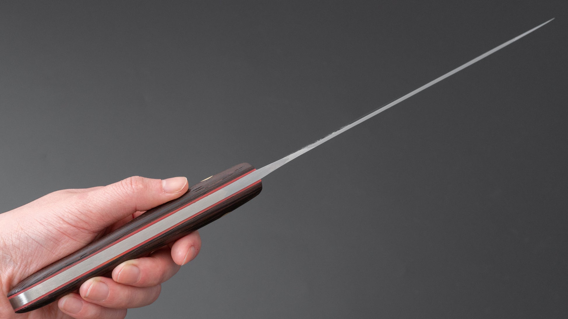 The Japanese slicer. A more specific knife shape ideal for portioning, trimming and finely slicing large cuts of meat, roasts, poultry or fish. The long and thin shape greatly reduces drag and is ideal to make long drawing cuts to thinly slice protein with high precision.