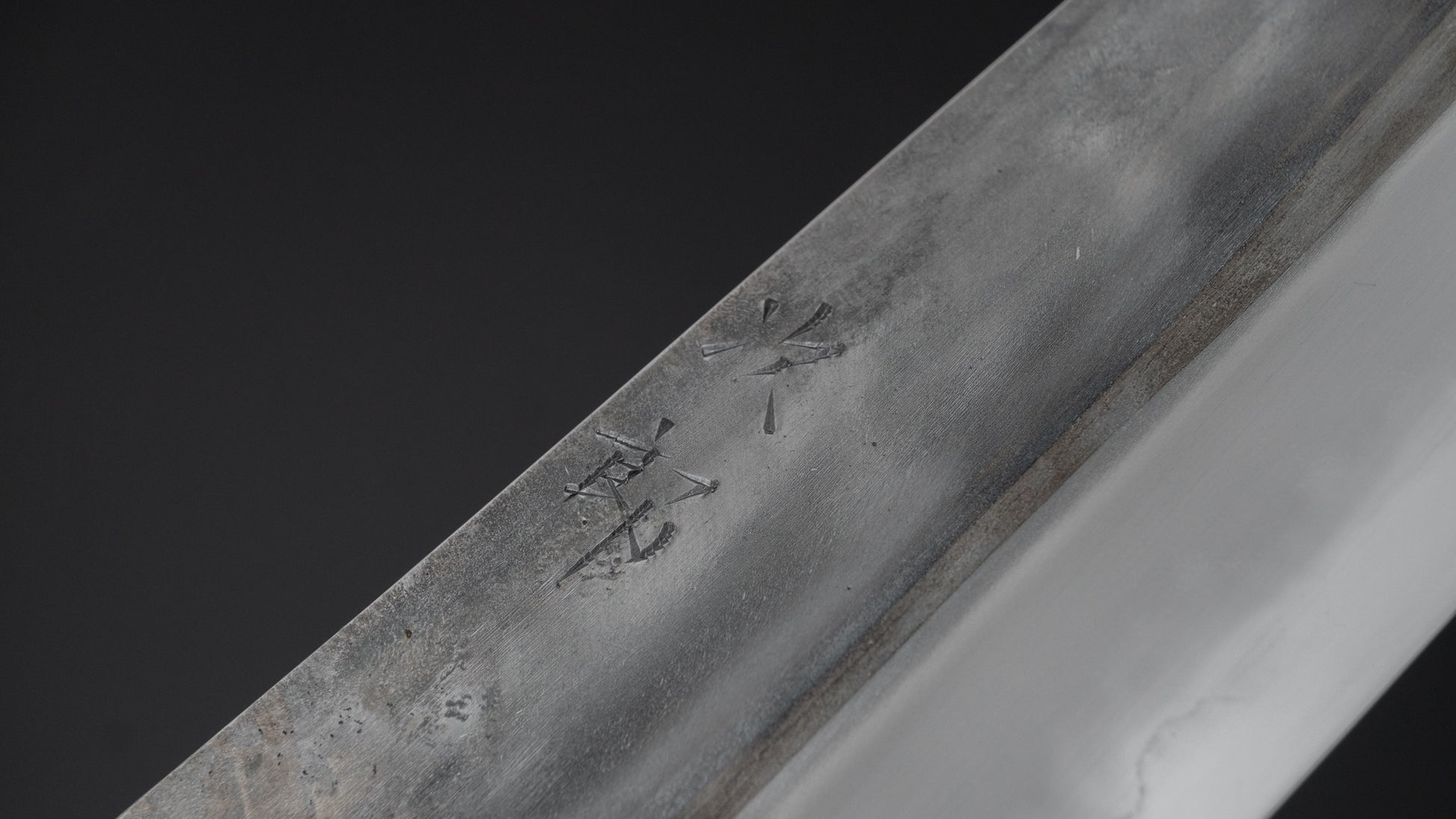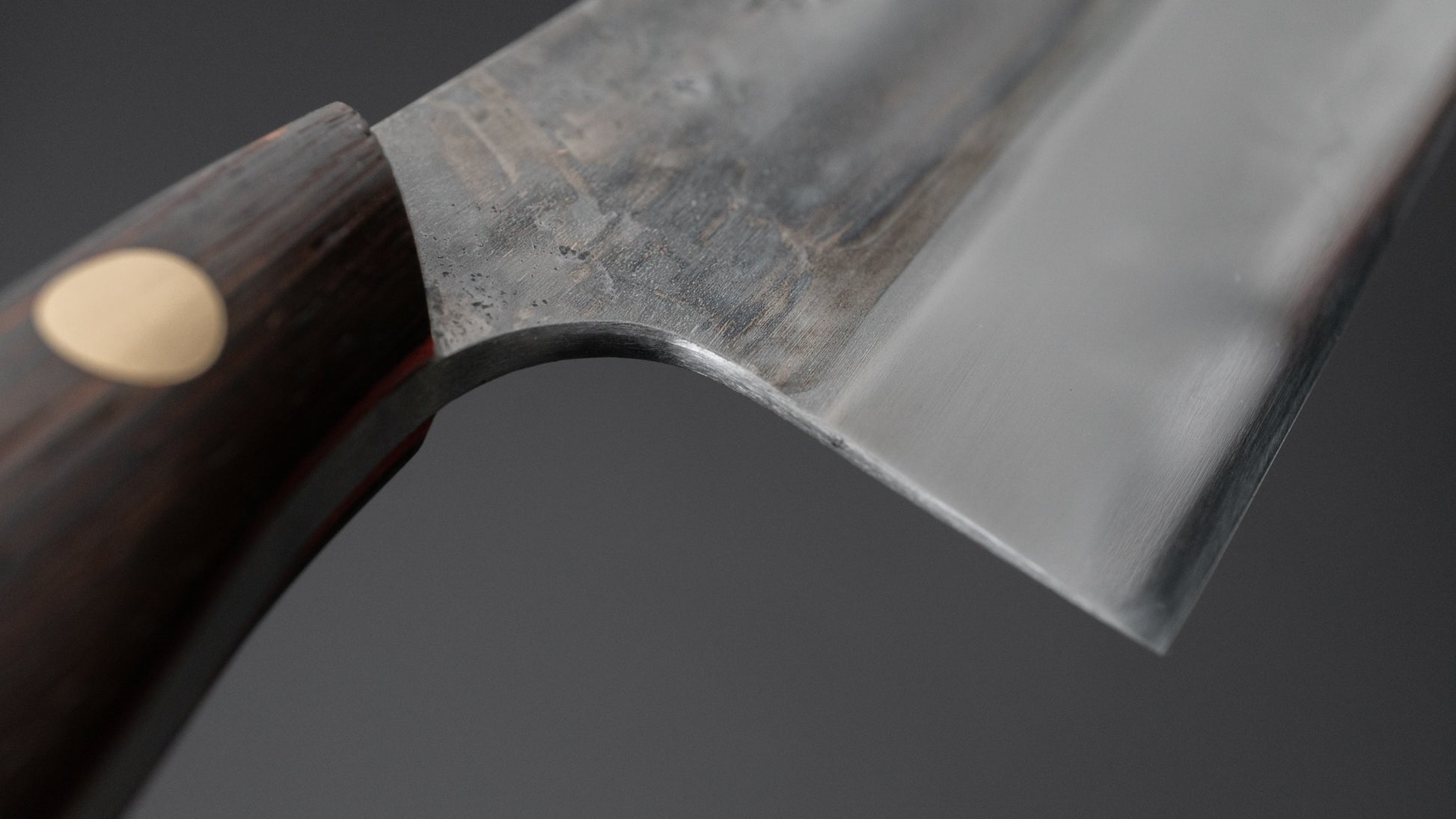 Zijn messen zijn gemaakt van Shirogami No.1 koolstofstaal, een van de zuiverste koolstofstaalsoorten die in de moderne messenmakerij worden gebruikt. Jiro-san neemt het smeedlassen zelf voor zijn rekening en combineert vakkundig de hardere kern met de zachtere ijzeren bekleding. Door het hele proces in eigen beheer te houden, heeft hij volledige controle over elk detail, waardoor hij elk mes op de ideale temperatuur kan smeden. Het is zeldzaam om messen te vinden die gemaakt zijn zonder voorgelamineerd staal, maar Jiro-sans messen hebben een dikke rug die alleen te bereiken is door zijn toegewijde vakmanschap.