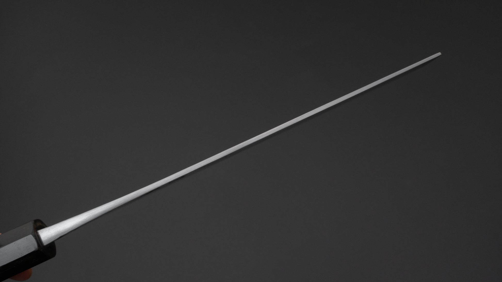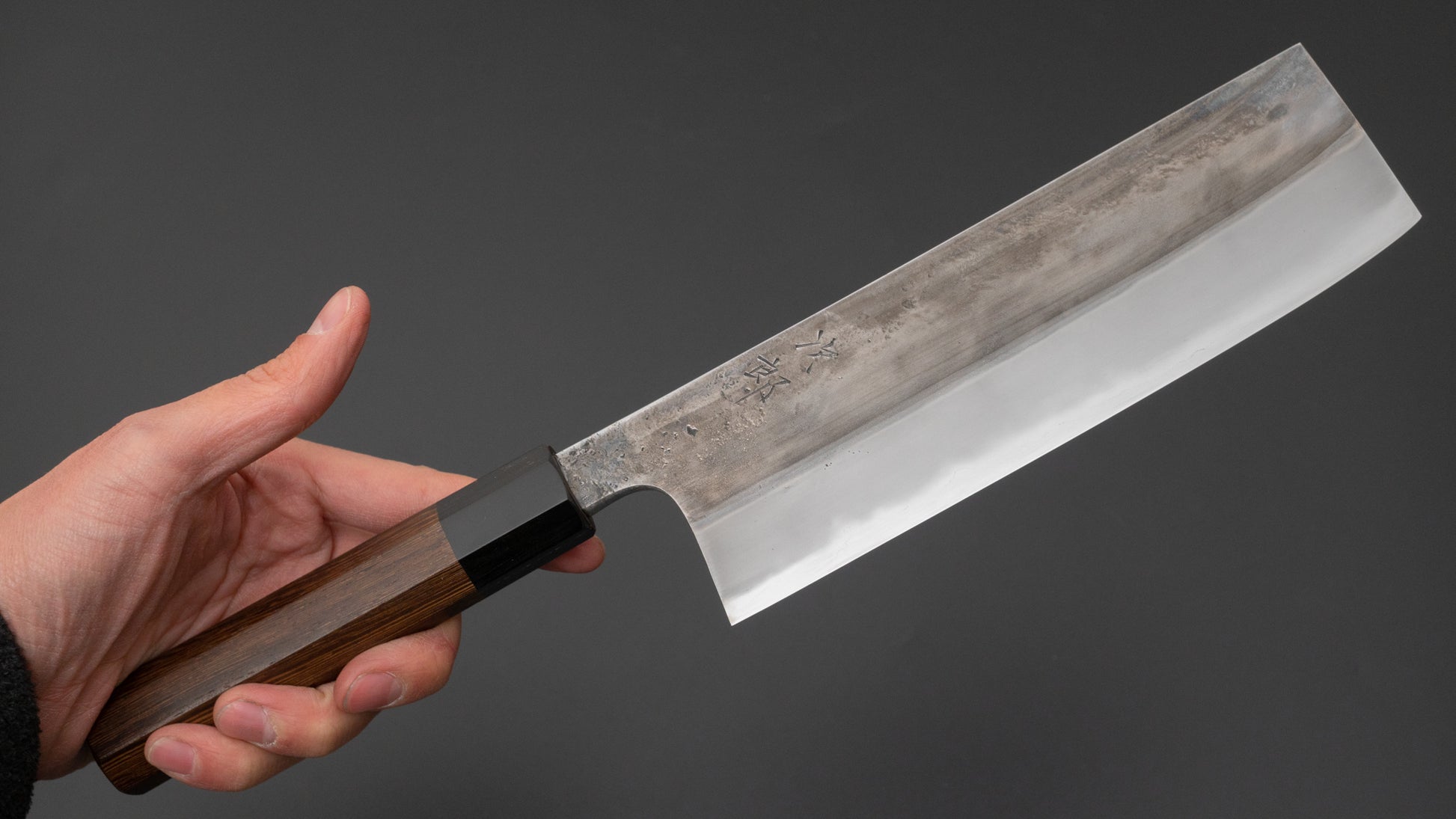 Zijn messen zijn gemaakt van Shirogami No.1 koolstofstaal, een van de zuiverste koolstofstaalsoorten die in de moderne messenmakerij worden gebruikt. Jiro-san neemt het smeedlassen zelf voor zijn rekening en combineert vakkundig de hardere kern met de zachtere ijzeren bekleding. Door het hele proces in eigen beheer te houden, heeft hij volledige controle over elk detail, waardoor hij elk mes op de ideale temperatuur kan smeden. Het is zeldzaam om messen te vinden die gemaakt zijn zonder voorgelamineerd staal, maar Jiro-sans messen hebben een dikke rug die alleen te bereiken is door zijn toegewijde vakmanschap.