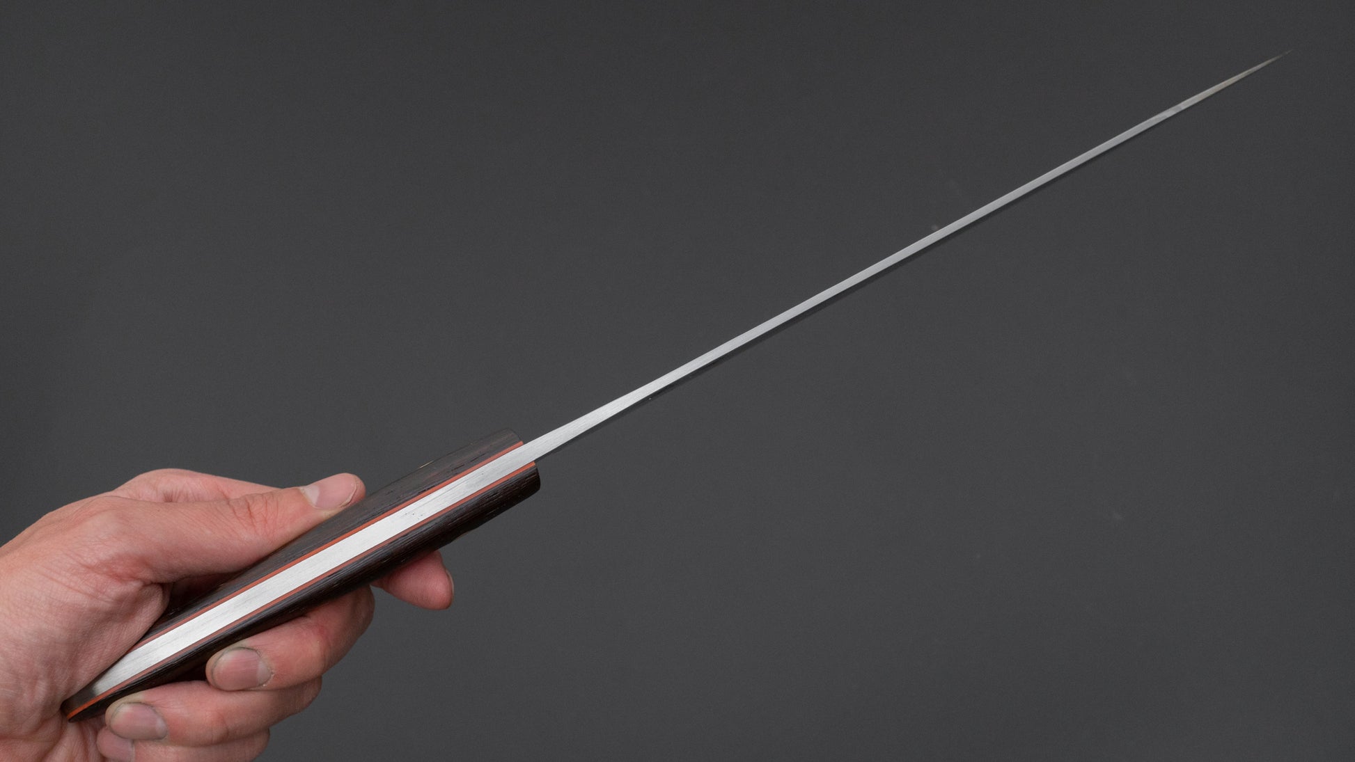 The Japanese slicer. A more specific knife shape ideal for portioning, trimming and finely slicing large cuts of meat, roasts, poultry or fish. The long and thin shape greatly reduces drag and is ideal to make long drawing cuts to thinly slice protein with high precision.