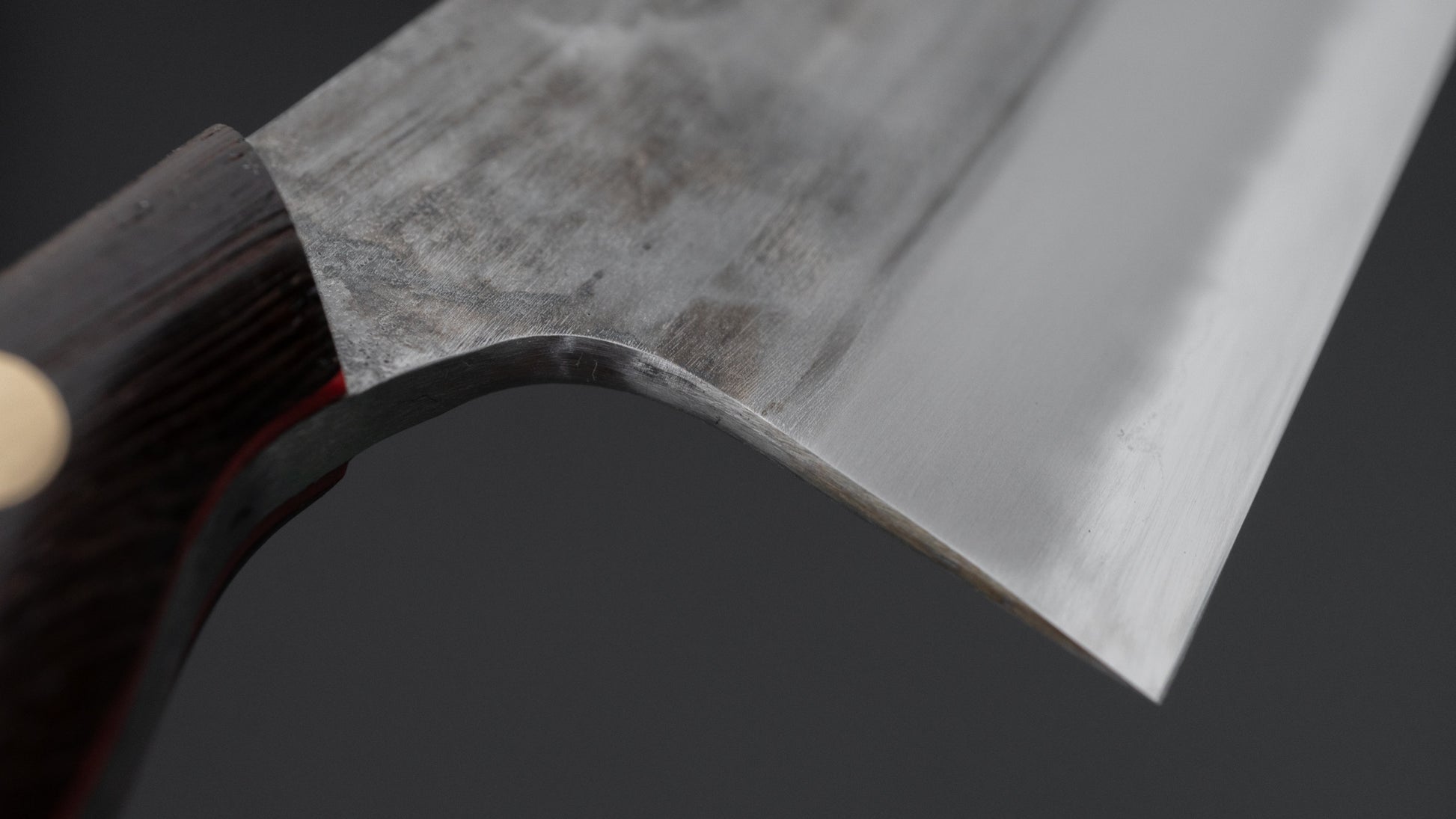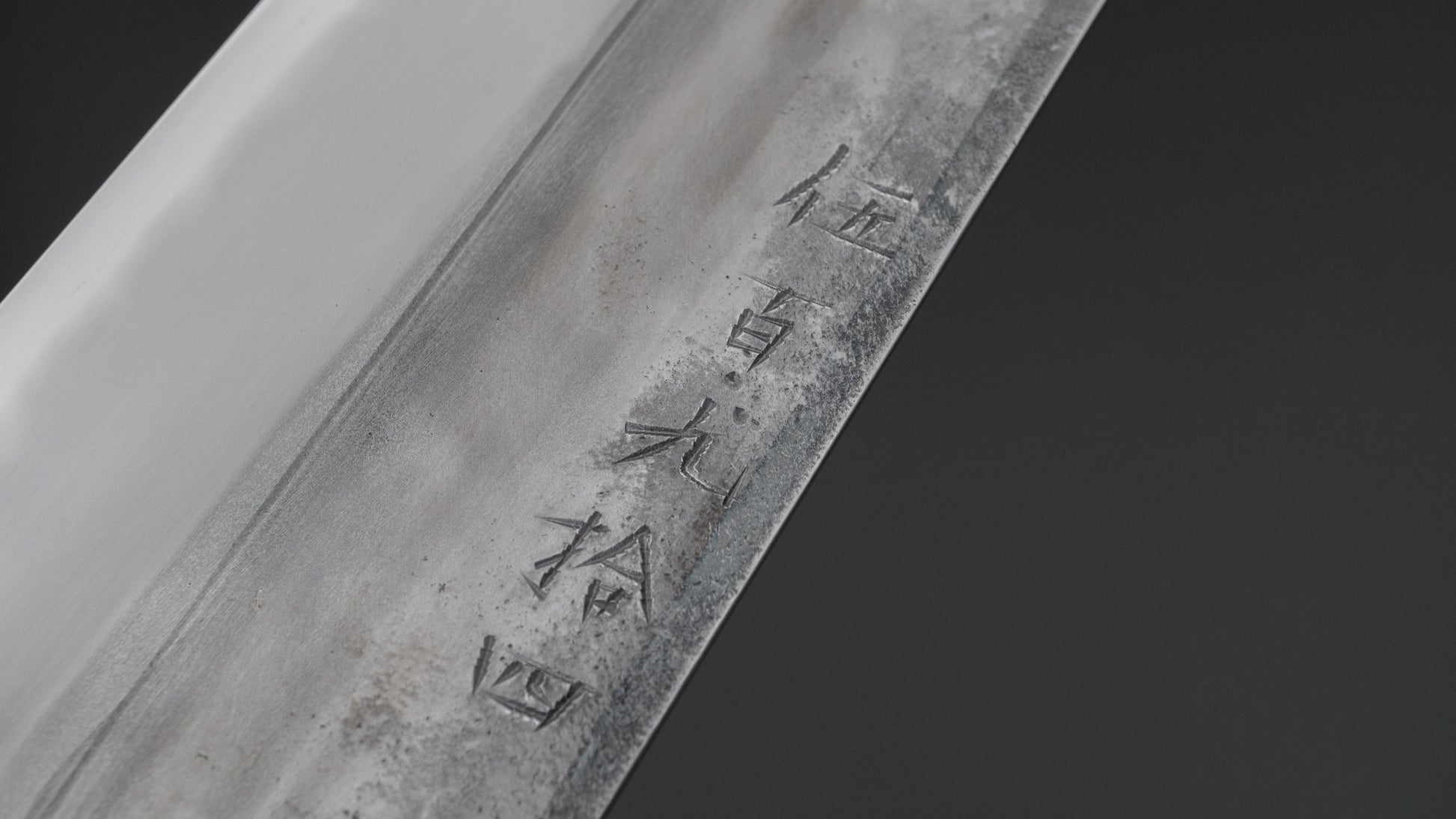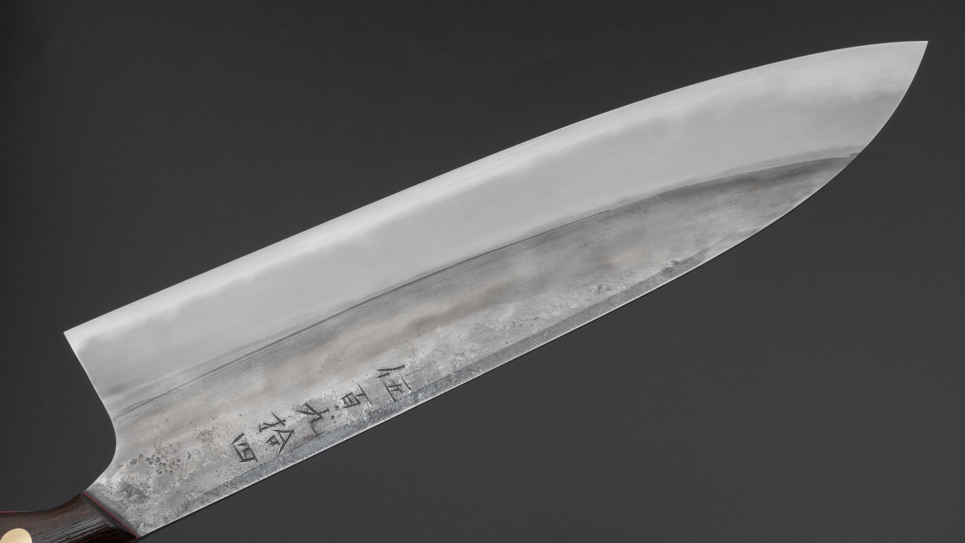 Zijn messen zijn gemaakt van Shirogami No.1 koolstofstaal, een van de zuiverste koolstofstaalsoorten die in de moderne messenmakerij worden gebruikt. Jiro-san neemt het smeedlassen zelf voor zijn rekening en combineert vakkundig de hardere kern met de zachtere ijzeren bekleding. Door het hele proces in eigen beheer te houden, heeft hij volledige controle over elk detail, waardoor hij elk mes op de ideale temperatuur kan smeden. Het is zeldzaam om messen te vinden die gemaakt zijn zonder voorgelamineerd staal, maar Jiro-sans messen hebben een dikke rug die alleen te bereiken is door zijn toegewijde vakmanschap.