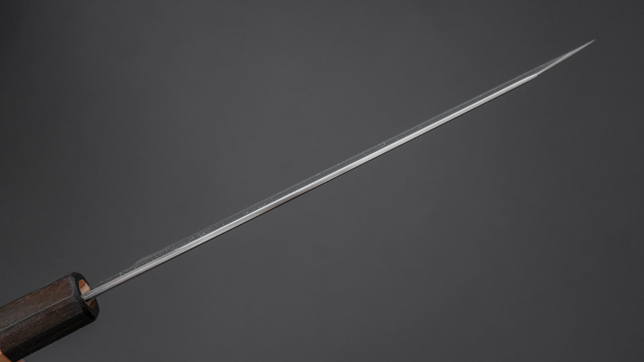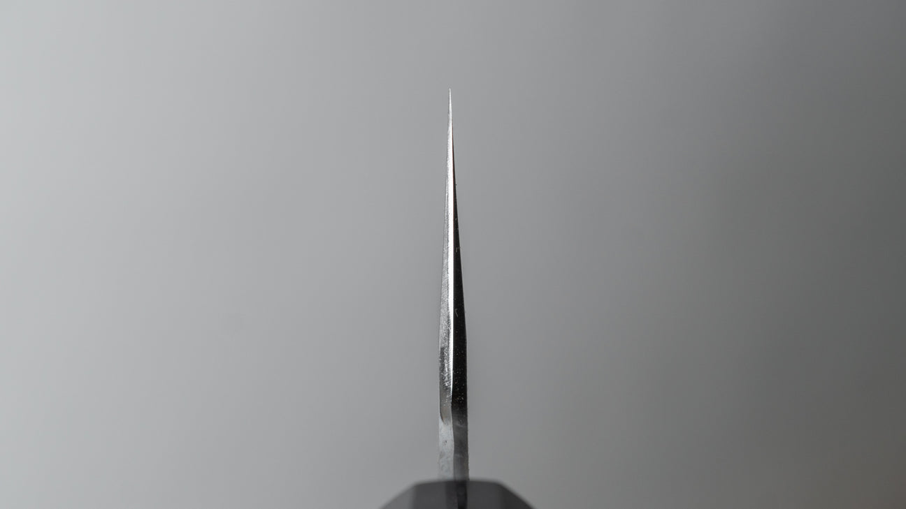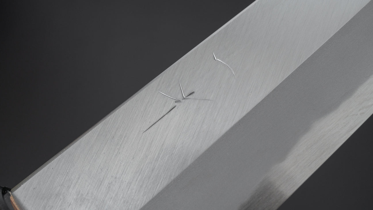 Kyuzo is a sharpener from Sakai. Son of one of the busiest sharpeners in this region and student of one of the most legendary and influential sharpeners. His style is a combination of these two teachings and is most known for this wide-bevel sharpening with a crisp and visible shinogi line. An extremely challenging way of grinding where symmetry is the most important factor. Kyuzo’s blades are characterized by their exceptional cutting performance and easy to maintain bevels. These pronounced wide bevels are easy to follow when thinning the blade resulting in better performance over time. In addition to the high level grind and sharpening these knives feature comfortably chamfered spine and choil increasing the overall quality of the blade.