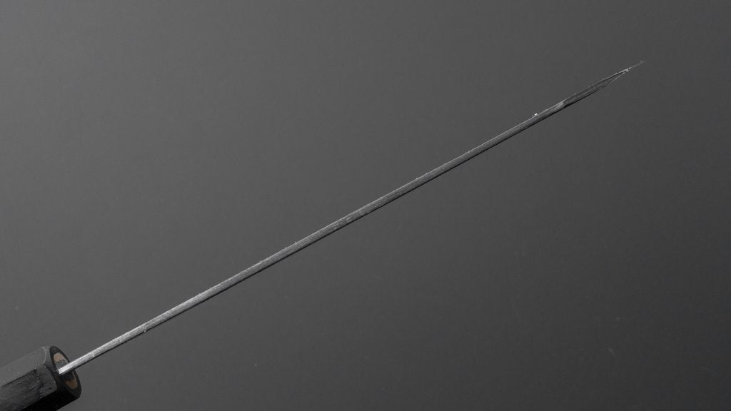 The Hitohira Togashi Kurouchi series features Blue and White steel #2 blades. These are characterized by their rustic kurouchi finish. This is a natural black scaling left over from the forging process. What makes this series unique is the fact the the blacksmith controls the thickness of the spine. With knives fully polished the sharpeners can adjust the spine thickness and taper to their liking. Here this is not the case otherwise the dark finish will be lost. Next to the aesthetics the kurouchi adds it reduces the oxidation on the part of the blade. While these blades look and feel more rustic the performance is incredible. The broad and finely polished bevels ensure a smooth cutting feel.