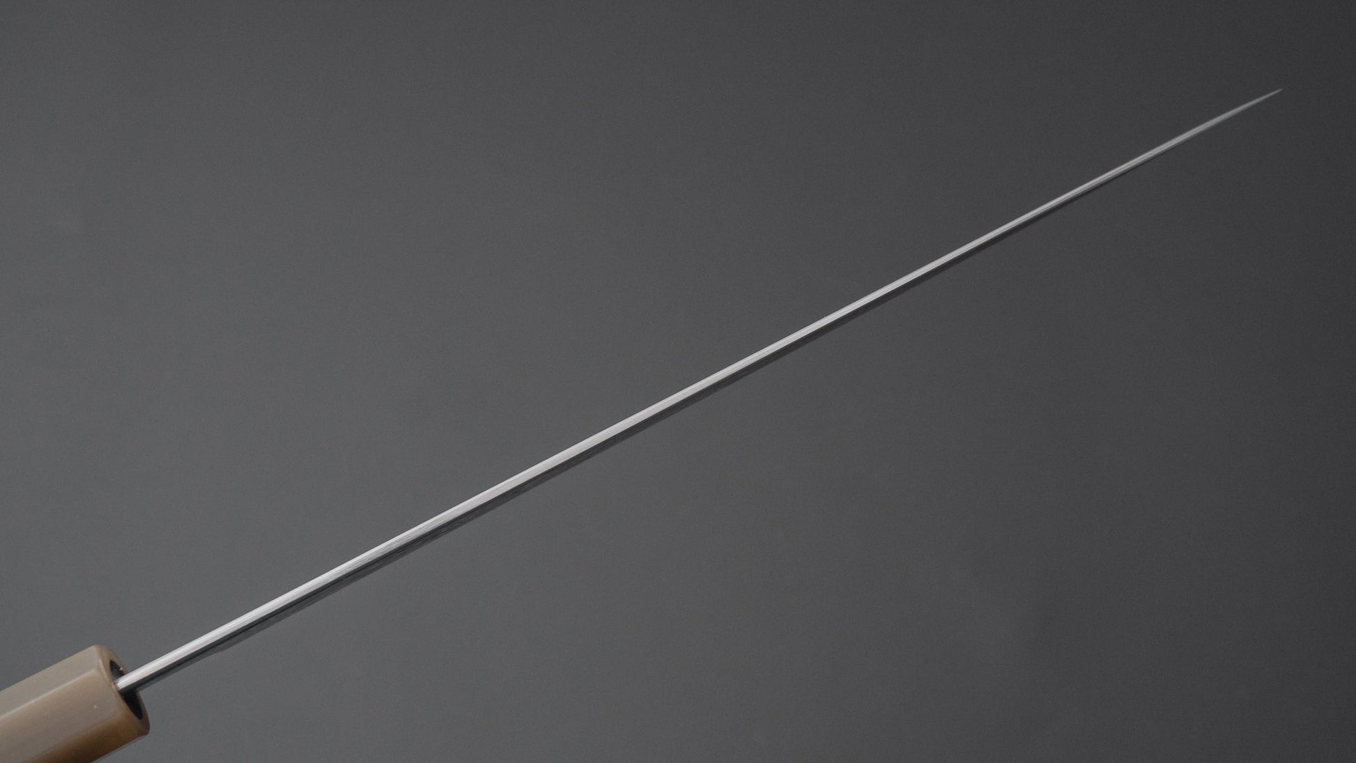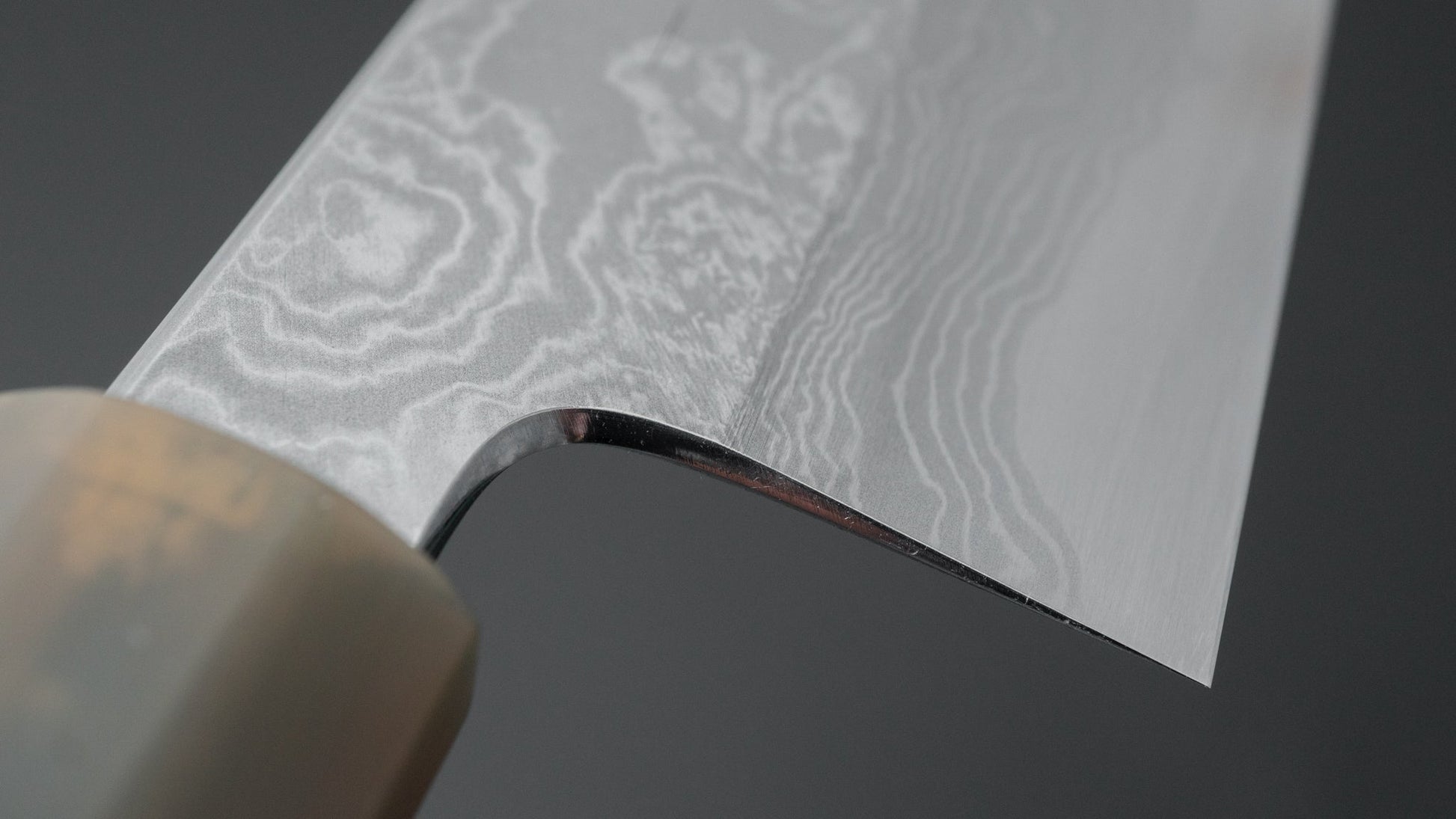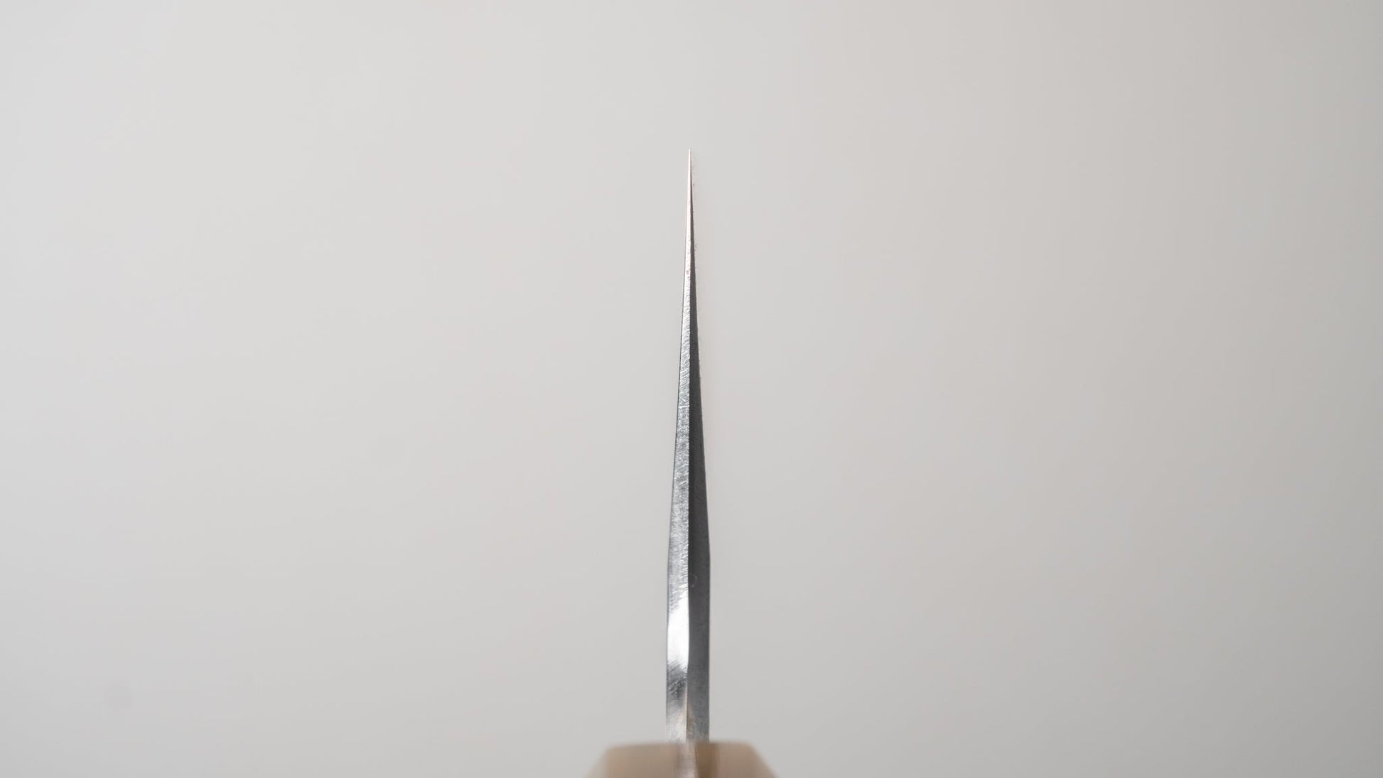 Kyuzo is a sharpener from Sakai. Son of one of the busiest sharpeners in this region and student of one of the most legendary and influential sharpeners. His style is a combination of these two teachings and is most known for this wide-bevel sharpening with a crisp and visible shinogi line. An extremely challenging way of grinding where symmetry is the most important factor. Kyuzo’s blades are characterized by their exceptional cutting performance and easy to maintain bevels. These pronounced wide bevels are easy to follow when thinning the blade resulting in better performance over time. In addition to the high level grind and sharpening these knives feature comfortably chamfered spine and choil increasing the overall quality of the blade.