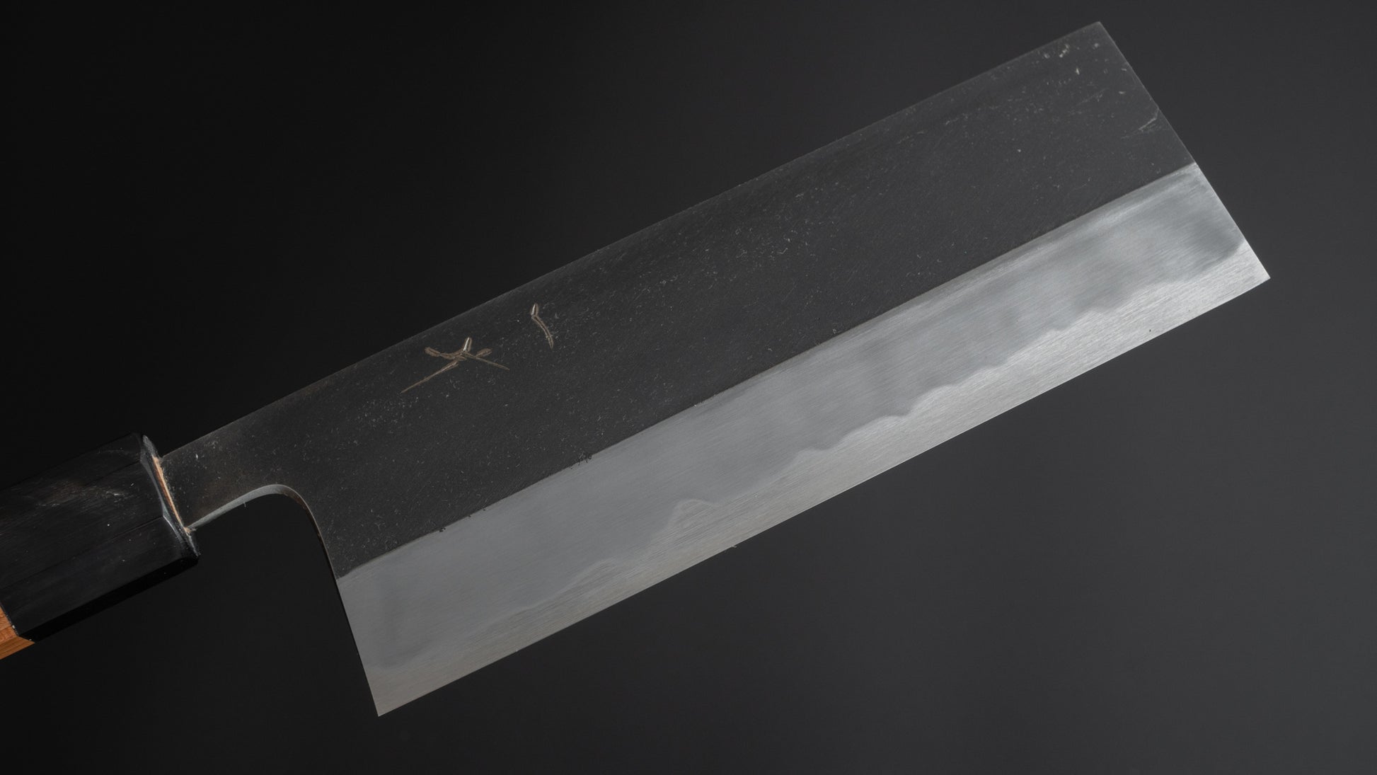Tanaka uses charcoal to quench when treating the knife, which does not produce a Kurouchi dark finish. So in order to produce the finish, which is both aesthetically pleasing and useful in protecting against rust, sharpener uses a special and secret technique that has been used in Sakai for a long time and etches the surface of the knife.