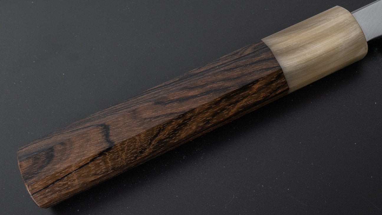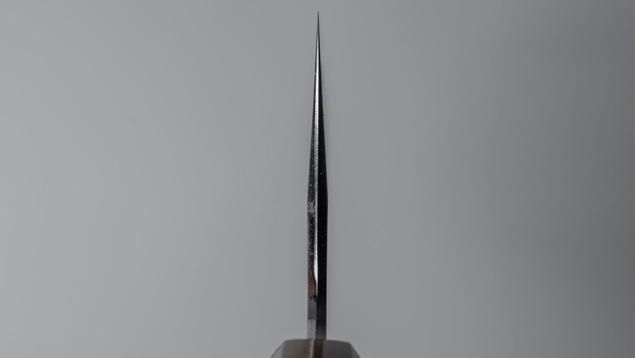 Kyuzo is a sharpener from Sakai. Son of one of the busiest sharpeners in this region and student of one of the most legendary and influential sharpeners. His style is a combination of these two teachings and is most known for this wide-bevel sharpening with a crisp and visible shinogi line. An extremely challenging way of grinding where symmetry is the most important factor. Kyuzo’s blades are characterized by their exceptional cutting performance and easy to maintain bevels. These pronounced wide bevels are easy to follow when thinning the blade resulting in better performance over time. In addition to the high level grind and sharpening these knives feature comfortably chamfered spine and choil increasing the overall quality of the blade.