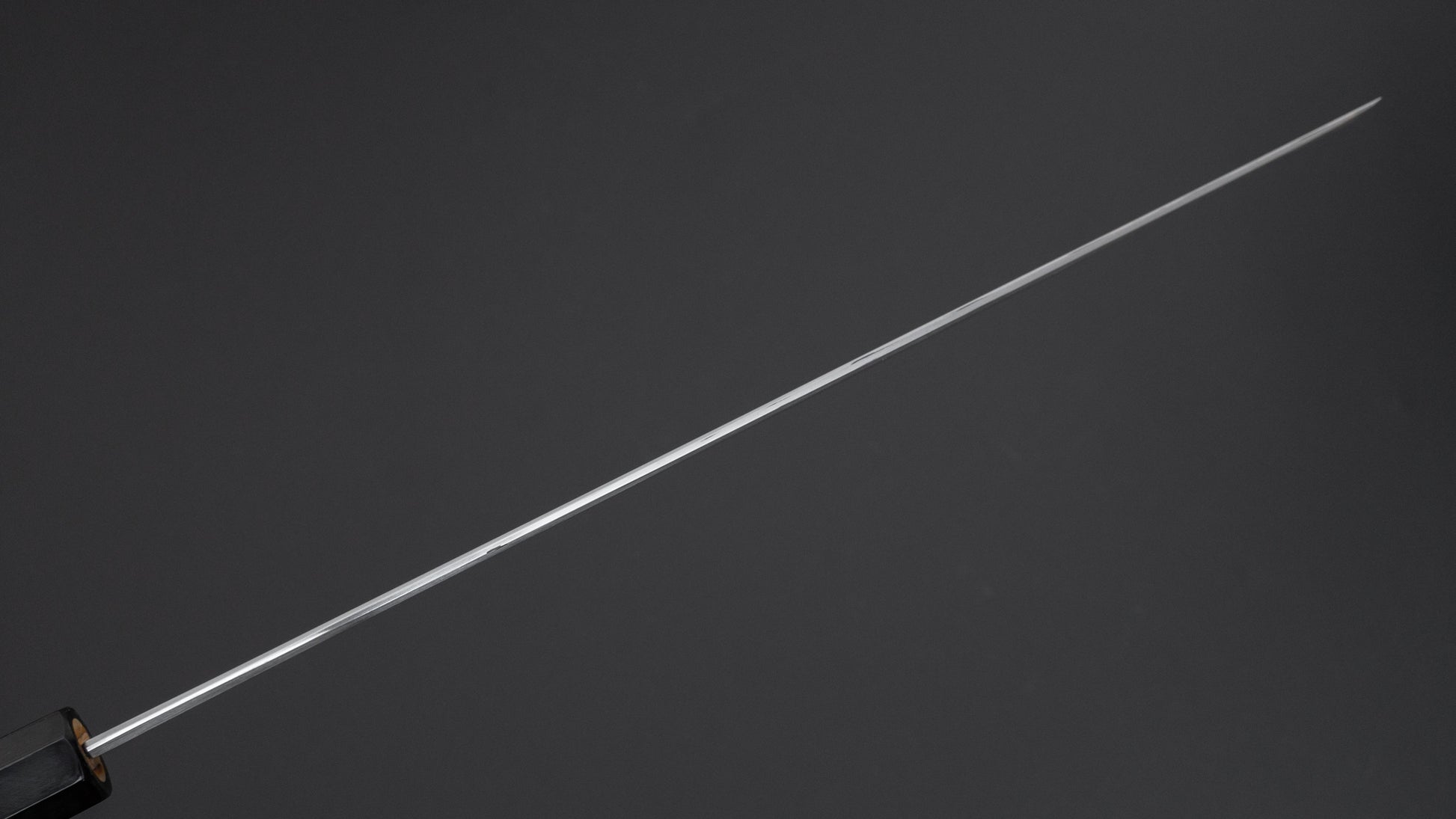 The traditional Japanese slicer. The king of knives and ofter referred to as ’Sushi knife’ it is used for slicing boneless protein. More specific and less versatile compared to the Sujihiki, the performance of the properly sharpened Yanagiba will yield much higher quality results due to their geometry and sharpness. Characteristics in steel are pronounced in single bevel knives and different sharpeners make for much variety.