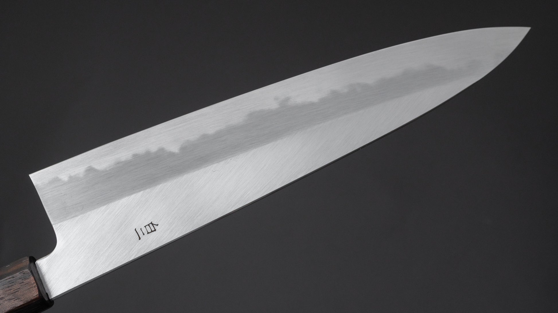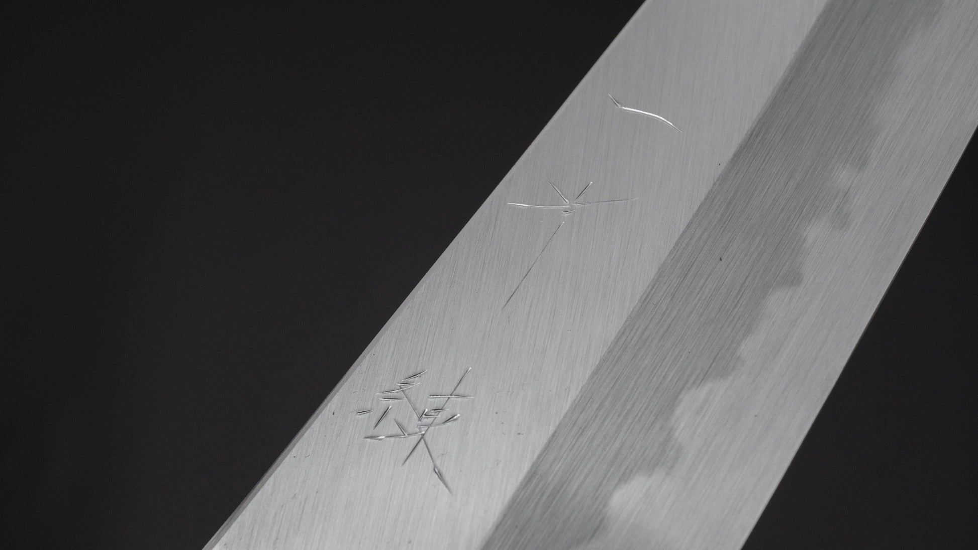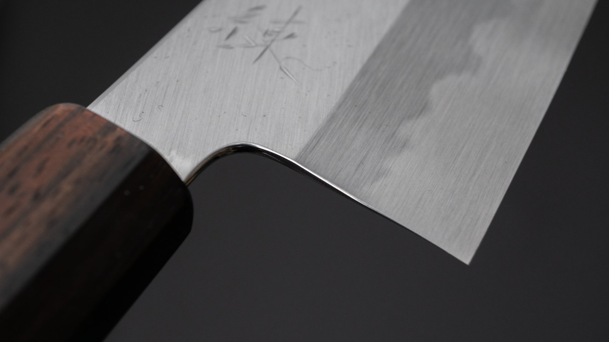 This is a carbon steel knife. Carbon steel is a non-stainless steel that lacks sufficient chromium and/or nickel to protect it from oxidation. As a result, it reacts to moisture and oxygen. While this may sound like a downside, it’s actually a key feature. Carbon steel forms a unique patina over time, is easy to sharpen, and offers excellent edge retention.