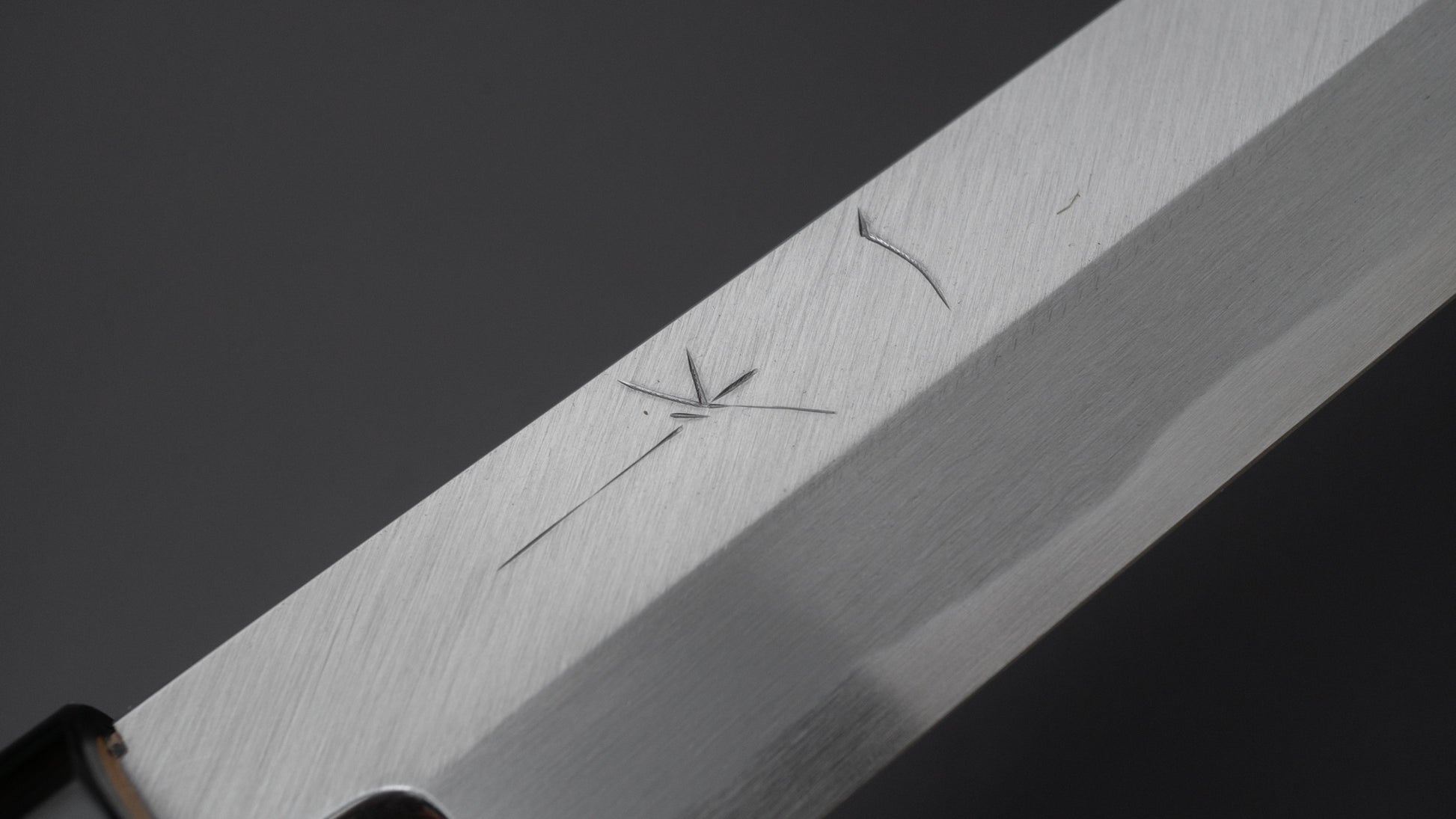 This is a carbon steel knife. Carbon steel is a non-stainless steel that lacks sufficient chromium and/or nickel to protect it from oxidation. As a result, it reacts to moisture and oxygen. While this may sound like a downside, it’s actually a key feature. Carbon steel forms a unique patina over time, is easy to sharpen, and offers excellent edge retention.
