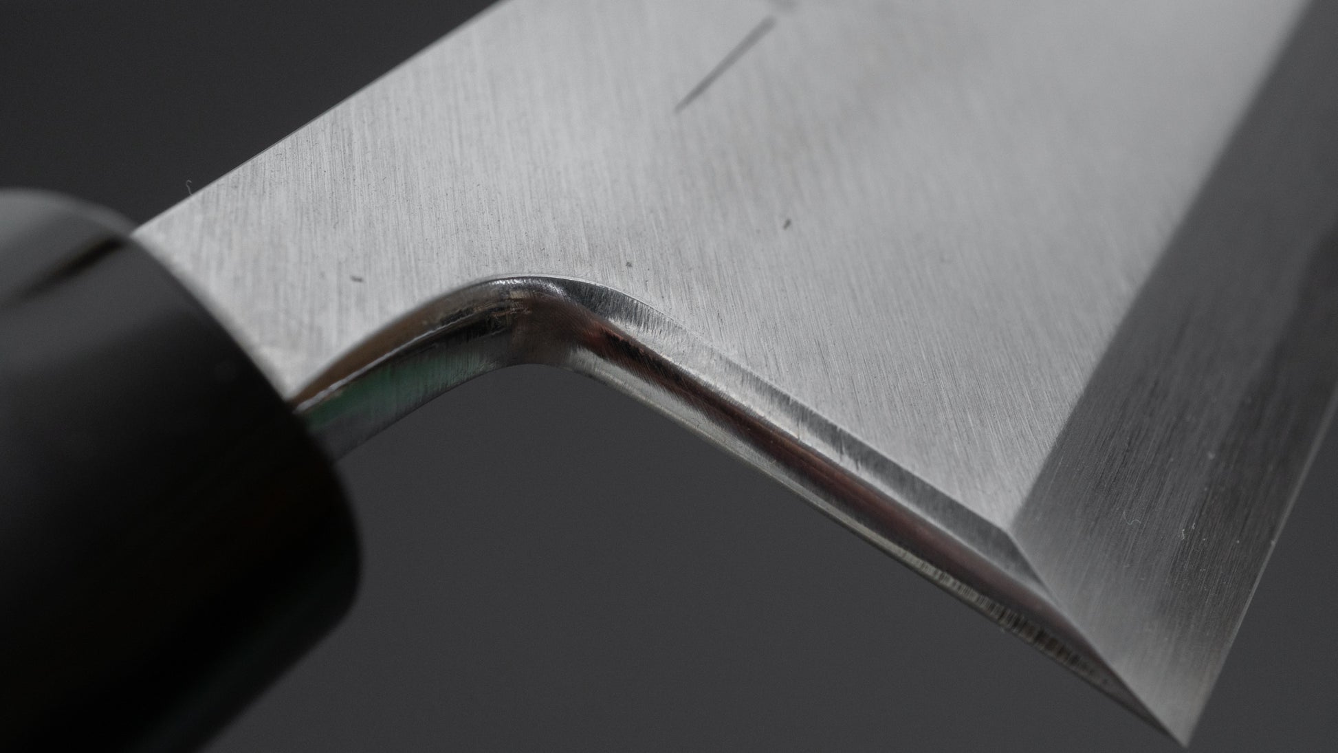 For this series these excellent blades are paired with Manzo’s great and consistent single bevel sharpening. Manzo is a sharpener in Sakai who exclusively sharpens single bevel knives. His sharpening style is characterized by a deep Ura (concave backside) and flat Kireha (primary bevel). In his opinion the deep ura contributes to a better geometry, performance and longer lasting performance throughout the life of the blade, even with repeated sharpening. A plus side of a deep ura is that you rarely get to see scratch marks across the ura when sharpening the back side yourself. Manzo sharpened knives are further refined with subtly chamfered back and choil, a good polish and good ‘out of the box’ edges.