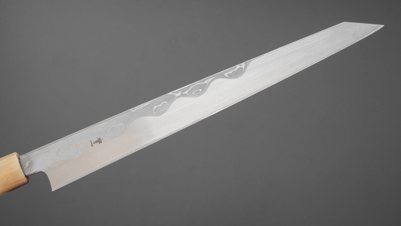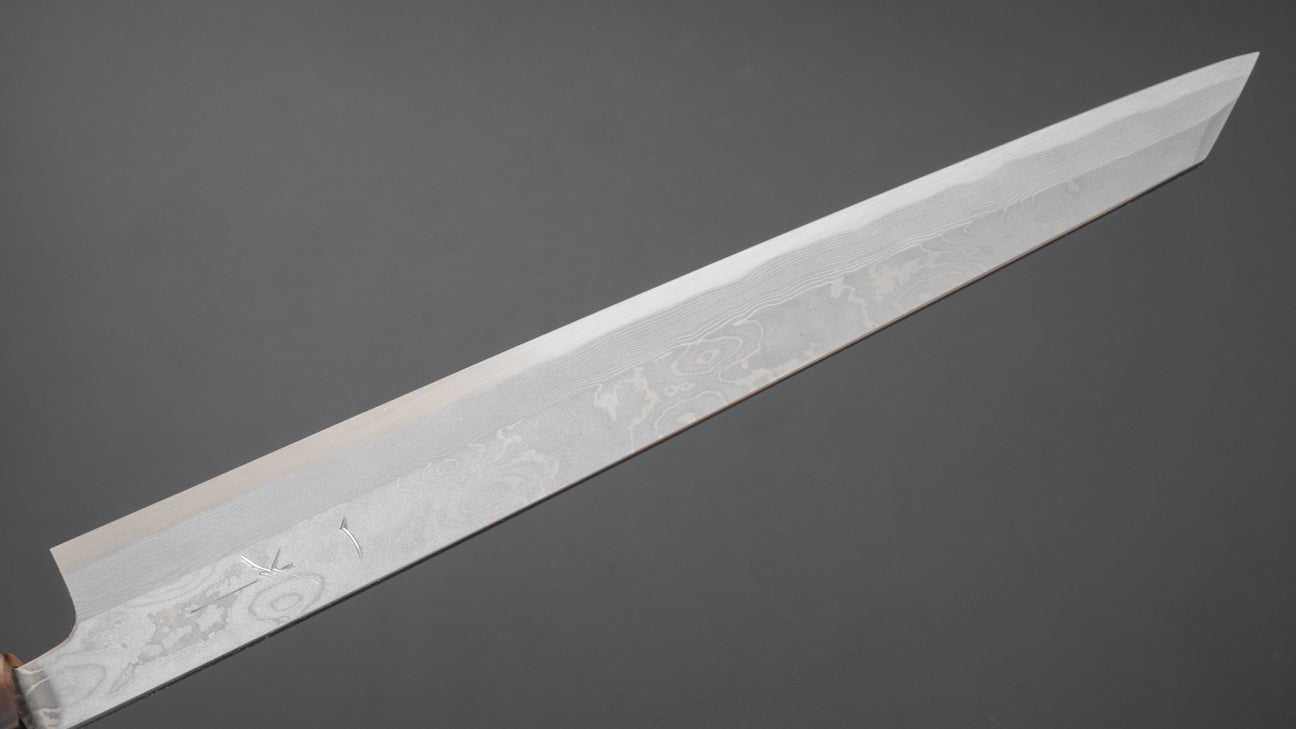 The traditional Japanese slicer. The king of knives and ofter referred to as ’Sushi knife’ it is used for slicing boneless protein. More specific and less versatile compared to the Sujihiki, the performance of the properly sharpened Yanagiba will yield much higher quality results due to their geometry and sharpness. Characteristics in steel are pronounced in single bevel knives and different sharpeners make for much variety.
