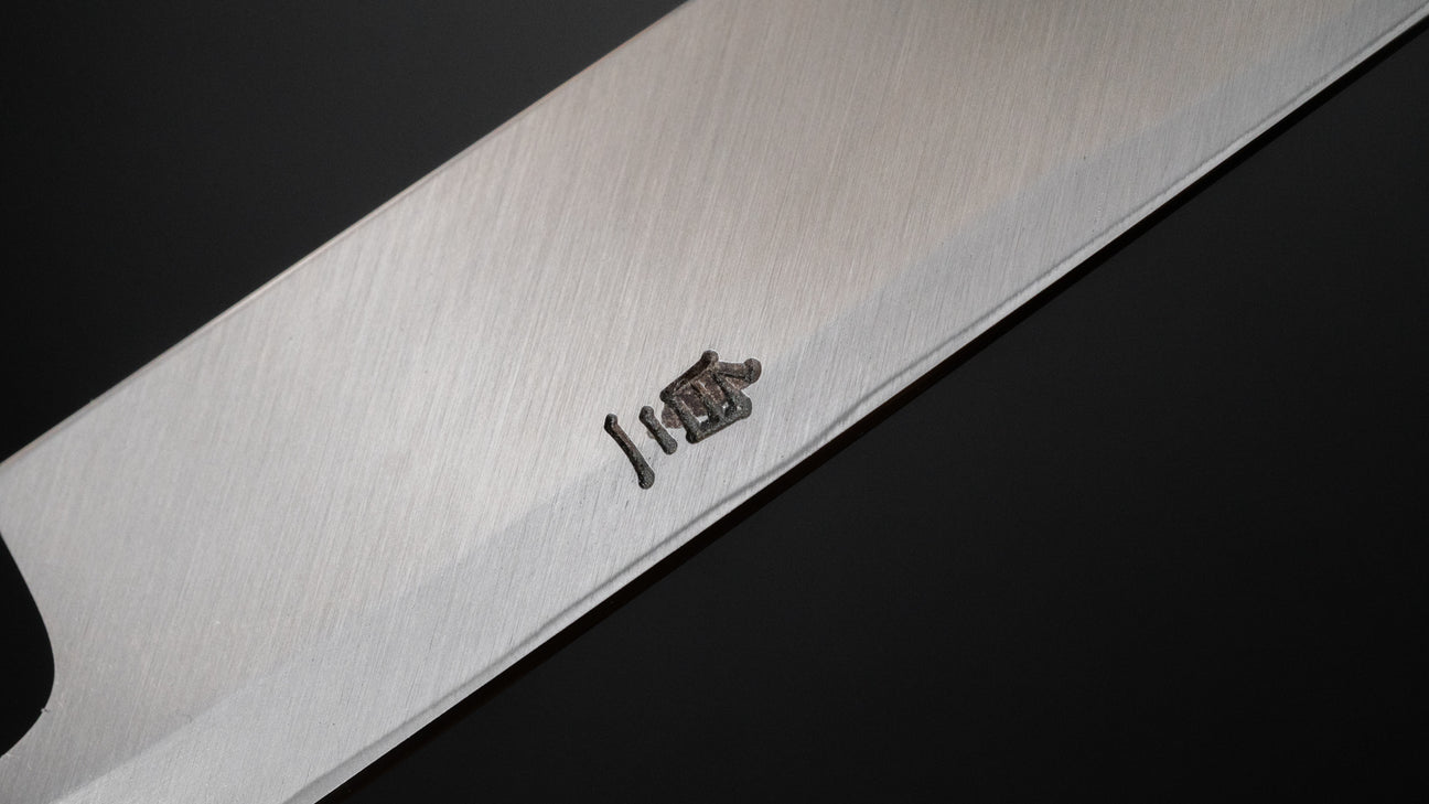 This is a carbon steel knife. Carbon steel is a non-stainless steel that lacks sufficient chromium and/or nickel to protect it from oxidation. As a result, it reacts to moisture and oxygen. While this may sound like a downside, it’s actually a key feature. Carbon steel forms a unique patina over time, is easy to sharpen, and offers excellent edge retention.