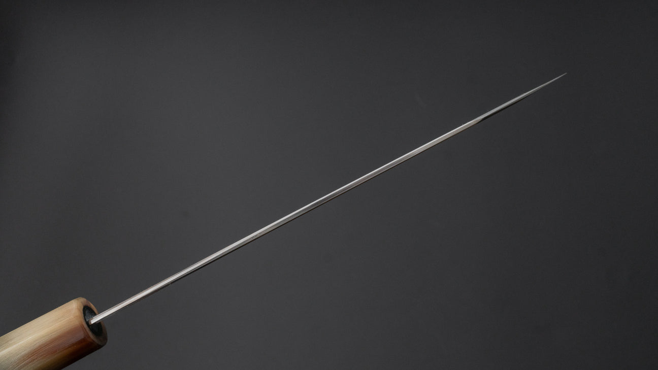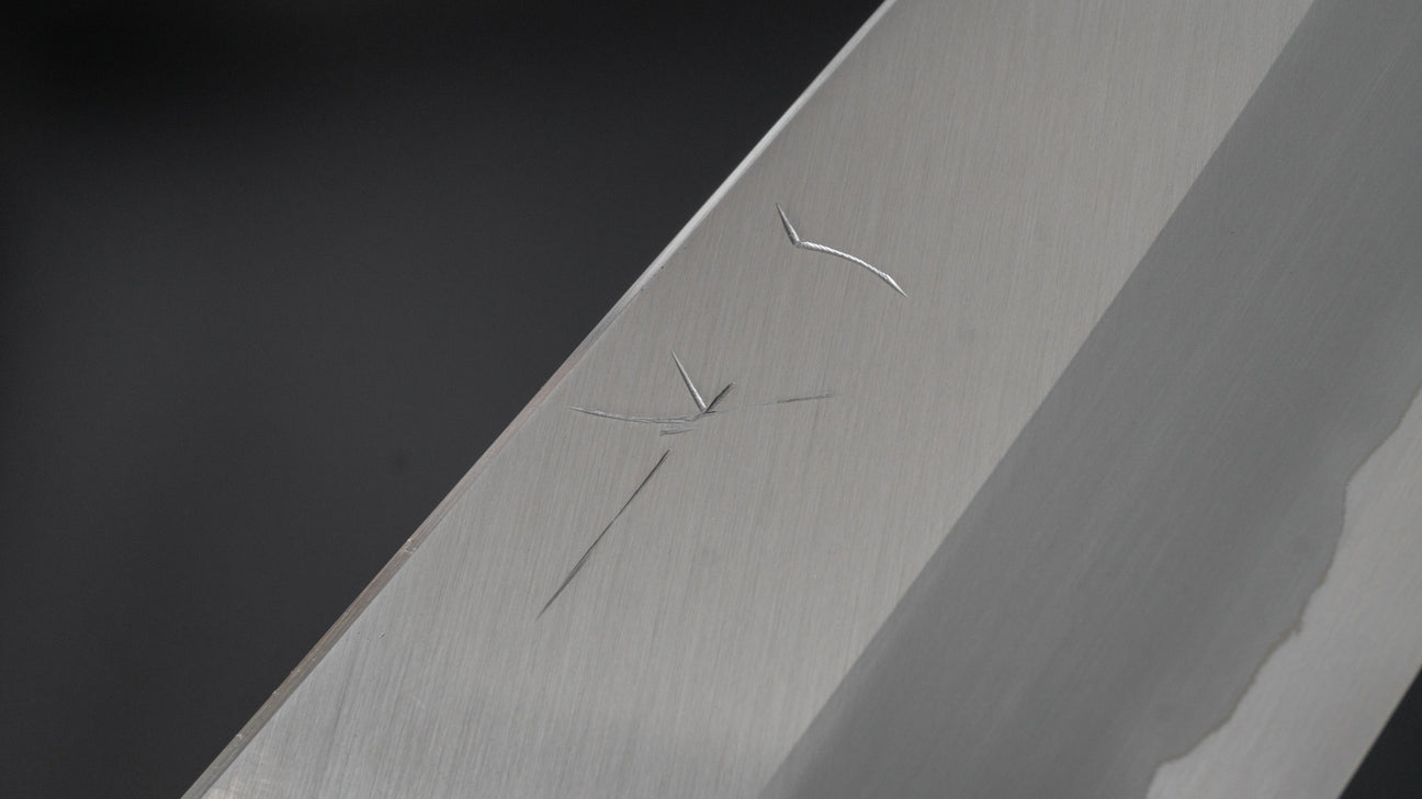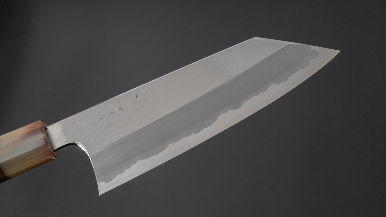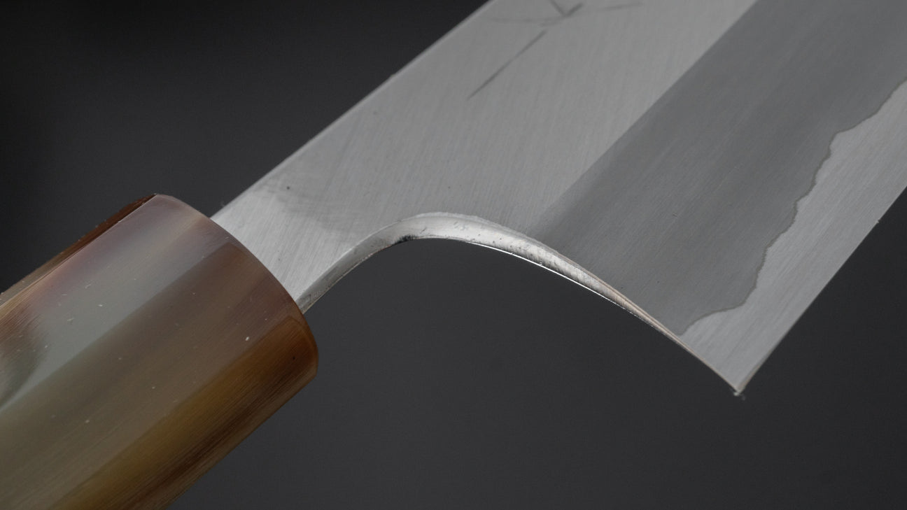 The Togashi Migaki with stainless cladding is one of the highest grade series we offer at Karasu. Made with only Blue #1 of White #1 steel this featured a unique Hitohira profile with a crisp wide bevels geometry that are highly polished. Superb cutting performance due to the thin edge but without feeling delicate. The fit and finish is high level with fine hardwood handles and characterizing heel polish.