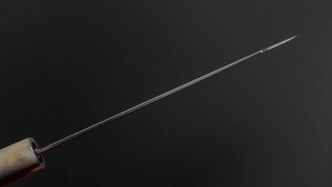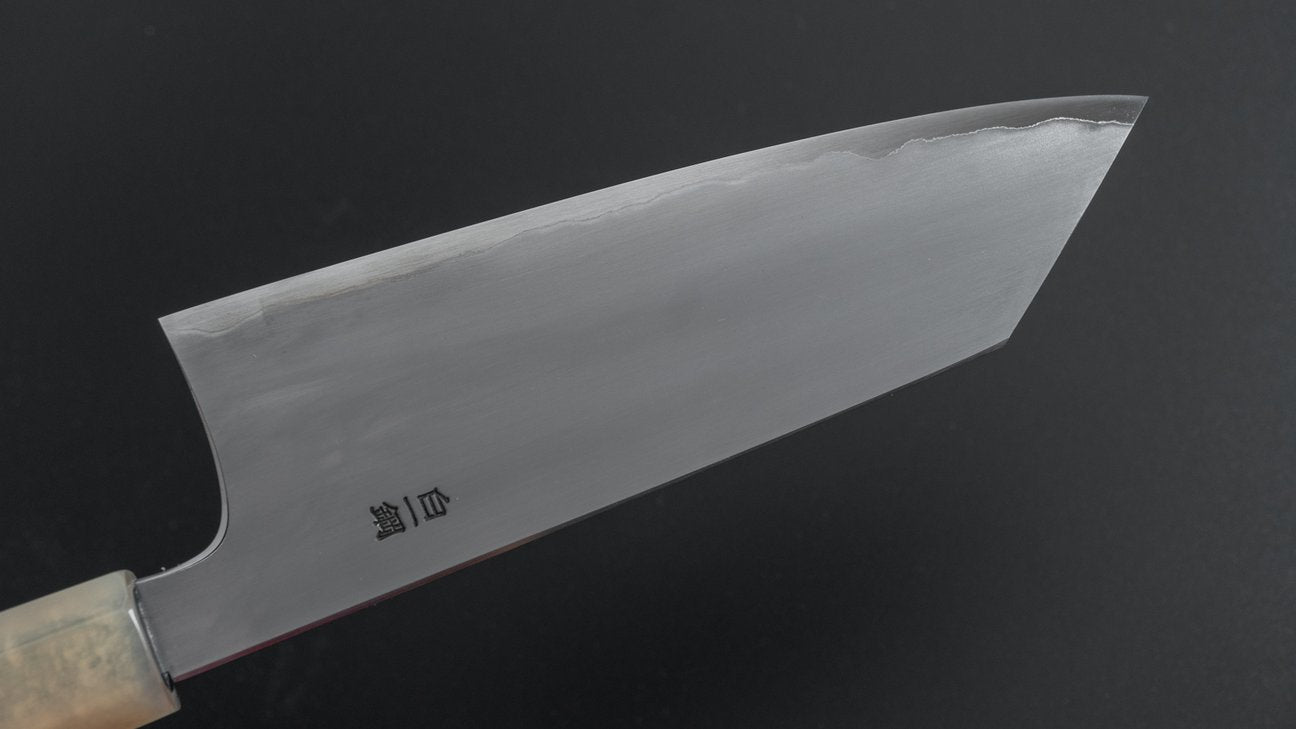 The Togashi Kasumi series belong in the high-end assortment we carry at Karasu. Similar to the Migaki series these are made with only Blue #1 and White #1 steel only with a difference in the geometry. Kenya Togashi is the sharpener of both lines but the Kasumi series is ground with a convex grind. The bevels are slightly rounded and these knives do not have a visible shinogi line. Characterized by their incredibly slick and clean aesthetics with smooth and solid performance. By Hitohira design, with high level fit and finish like polished heel and spine and amazing handle quality. To us both the Kasumi and Migaki series by Togashi resemble the traditional craftsmanship and refinement in a way we appreciate most.