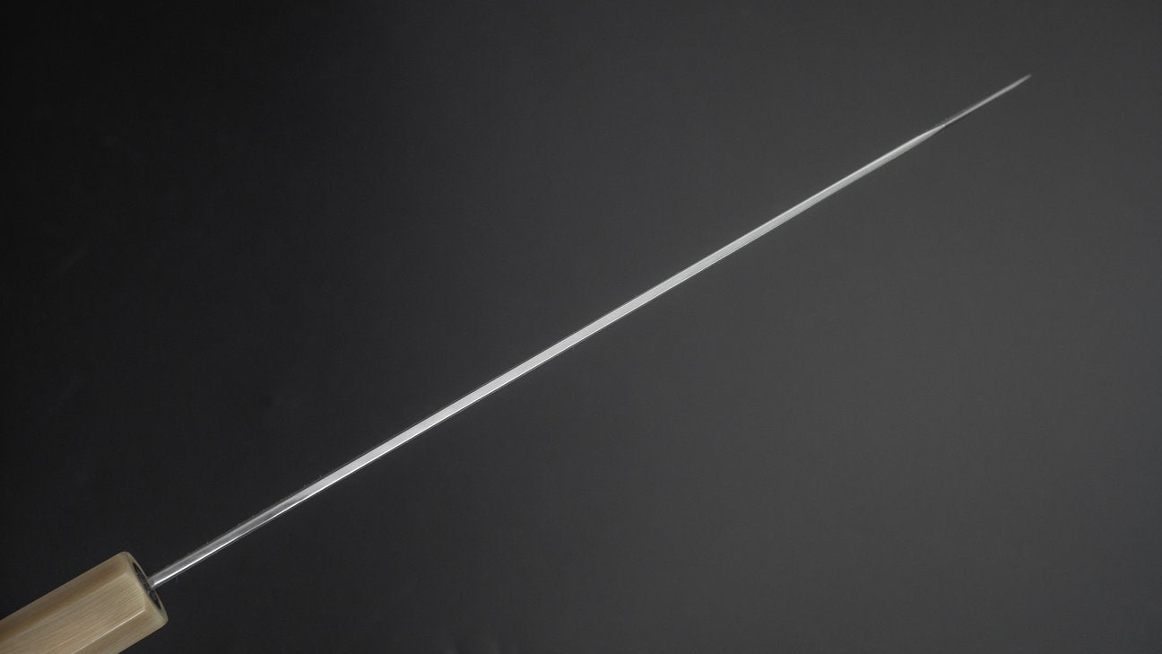 Master Kenji Togashi is one of the most celebrated and distiguisted blacksmith from Sakai. Not only a “Dentokogeshi” (certified traditional craftsman) but also awarded with a medal from the emperor for his accomplishments and service. One of the, if not the, most honourable and prestigious decorations in Japan. To be awarded such a prestigious titles is proof of vast knowledge and skill. He is amongst the very few remaining blacksmiths in Japan with the skillset to forge water-quenched Honyaki blades. A true master of traditional techniques. Togashi made knives are characterised by their durability and hardness while still easy to sharpen. Not only the steel quality but also their in-house sharpening is praiseworthy. In charge of the in-house sharpening is Kenya Togashi, the third son of Togashi San, and from him we see some of the most true and consistent single and double-bevel sharpening we've come across. All their knives really feel like they've been made with the intention to last for years.