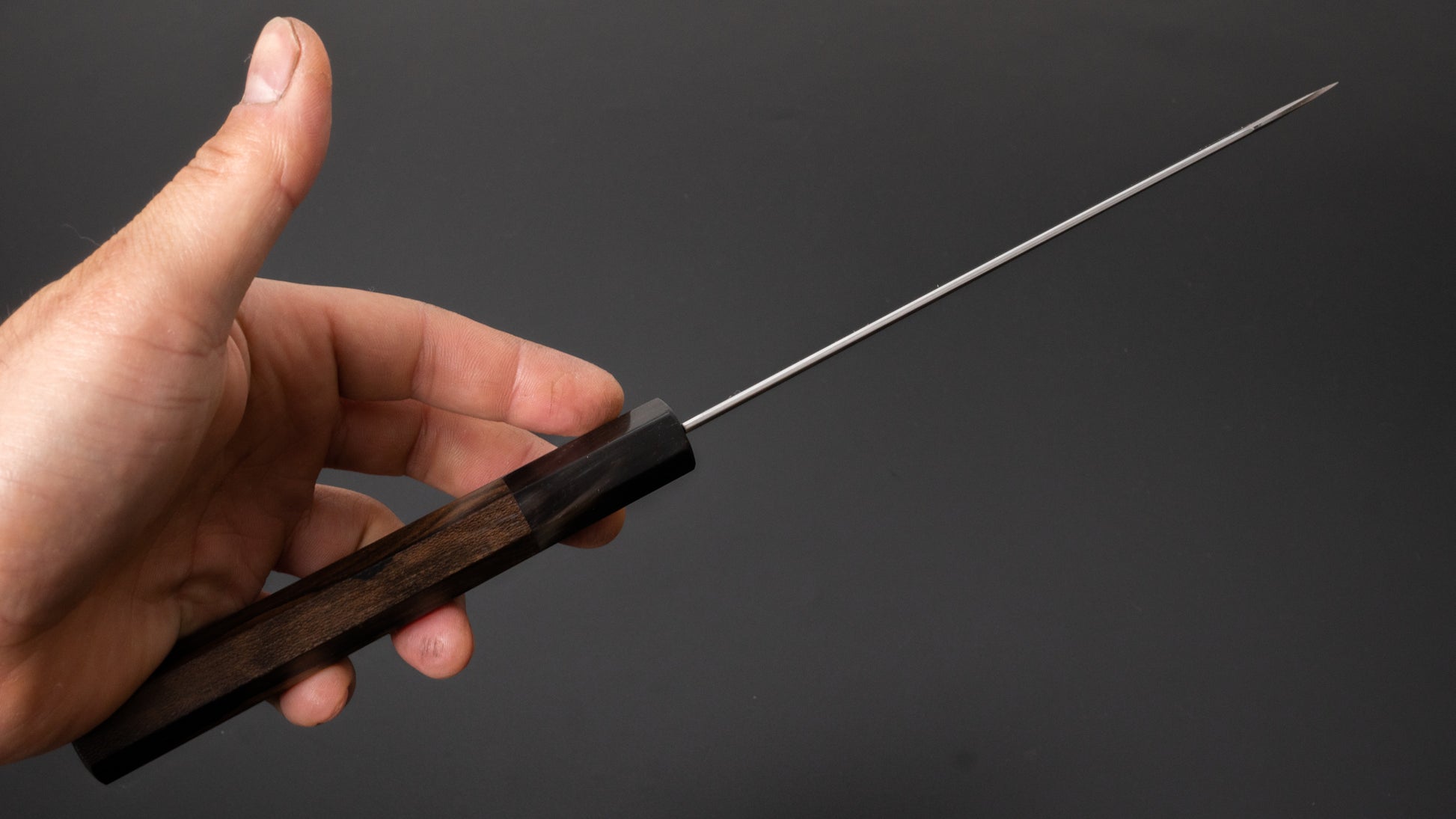 The Santoku is every bit as versatile as a Gyuto, but it’s more at home in everyday cooking. Probably the most used to-go knife at home. It’s easy to handle, super nimble, and great for just about any kitchen task.
