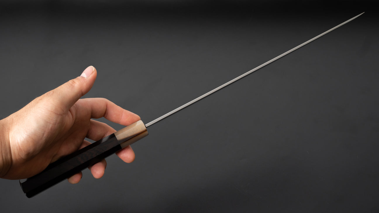 The Yanagiba is the traditional Japanese slicer, often referred to as the “sushi knife.” It’s built for slicing boneless proteins with high precision. While it’s a bit more specialised and less versatile than a Sujihiki, a well-sharpened Yanagiba delivers outstanding performance thanks to its unique geometry and razor-sharp edge.