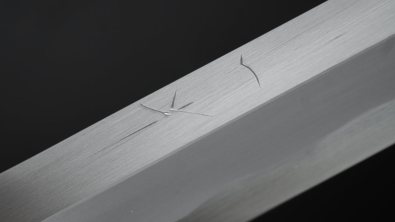 This is a carbon steel knife. Carbon steel is a non-stainless steel that lacks sufficient chromium and/or nickel to protect it from oxidation. As a result, it reacts to moisture and oxygen. While this may sound like a downside, it’s actually a key feature. Carbon steel forms a unique patina over time, is easy to sharpen, and offers excellent edge retention.