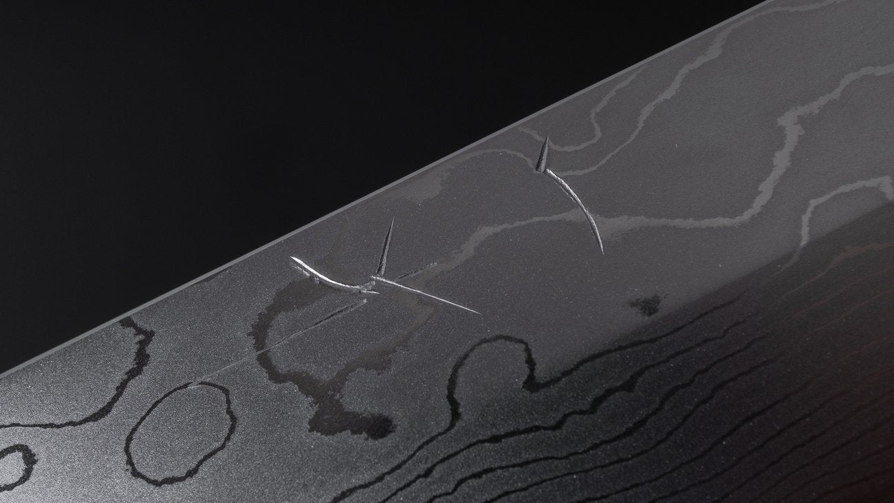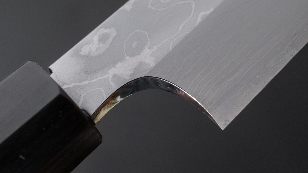 This is a carbon steel knife. Carbon steel is a non-stainless steel that lacks sufficient chromium and/or nickel to protect it from oxidation. As a result, it reacts to moisture and oxygen. While this may sound like a downside, it’s actually a key feature. Carbon steel forms a unique patina over time, is easy to sharpen, and offers excellent edge retention.