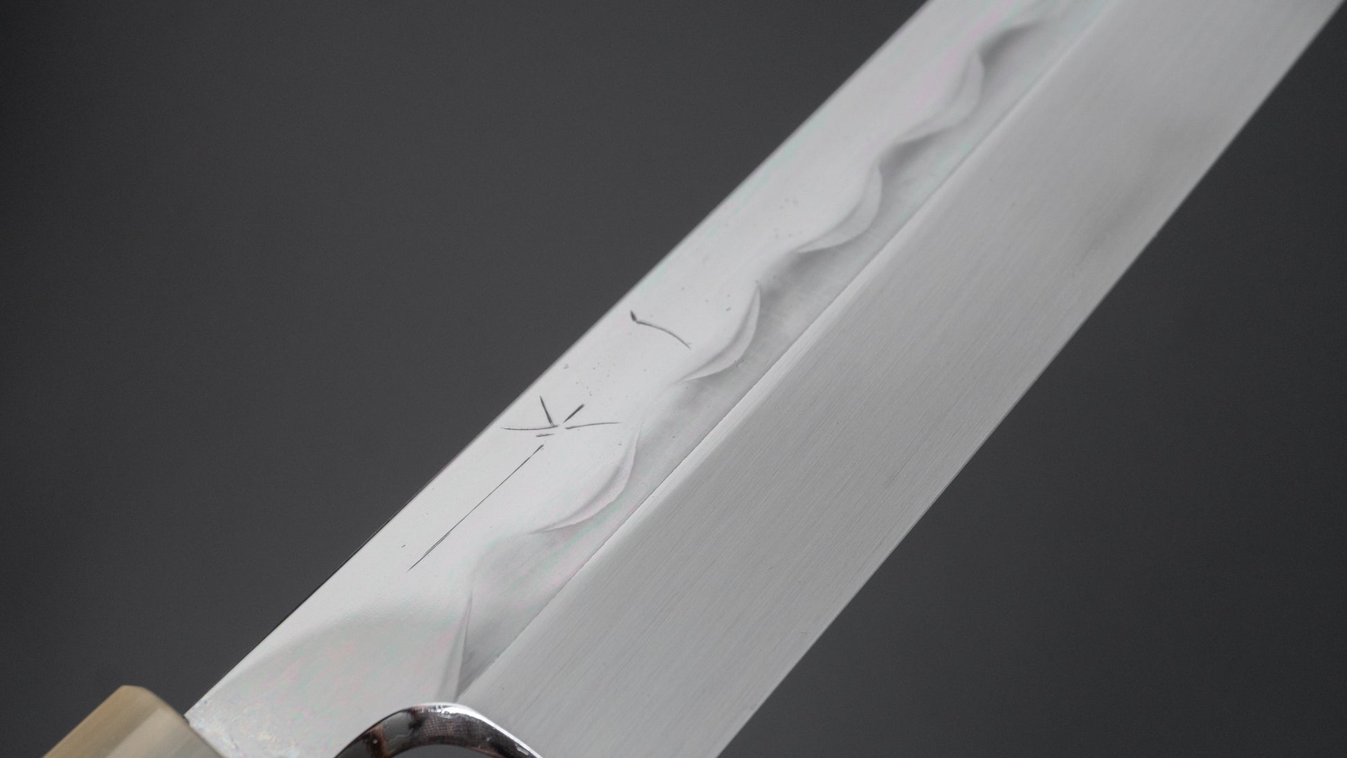 This is a water quenched (Mizu) White steel #1 blade which is considered the hardest and most challenging of all combination. Also the fact that this is a very long Sakimaru Yanagi and was forged in the summer makes it considerably more impressive.