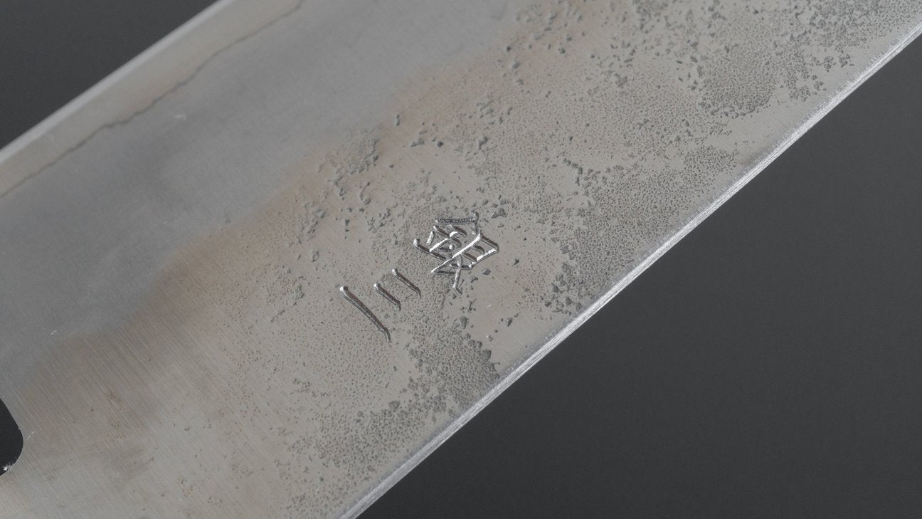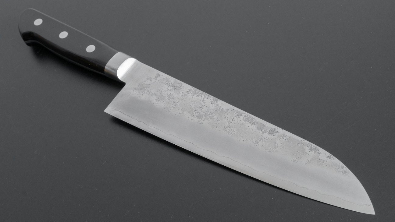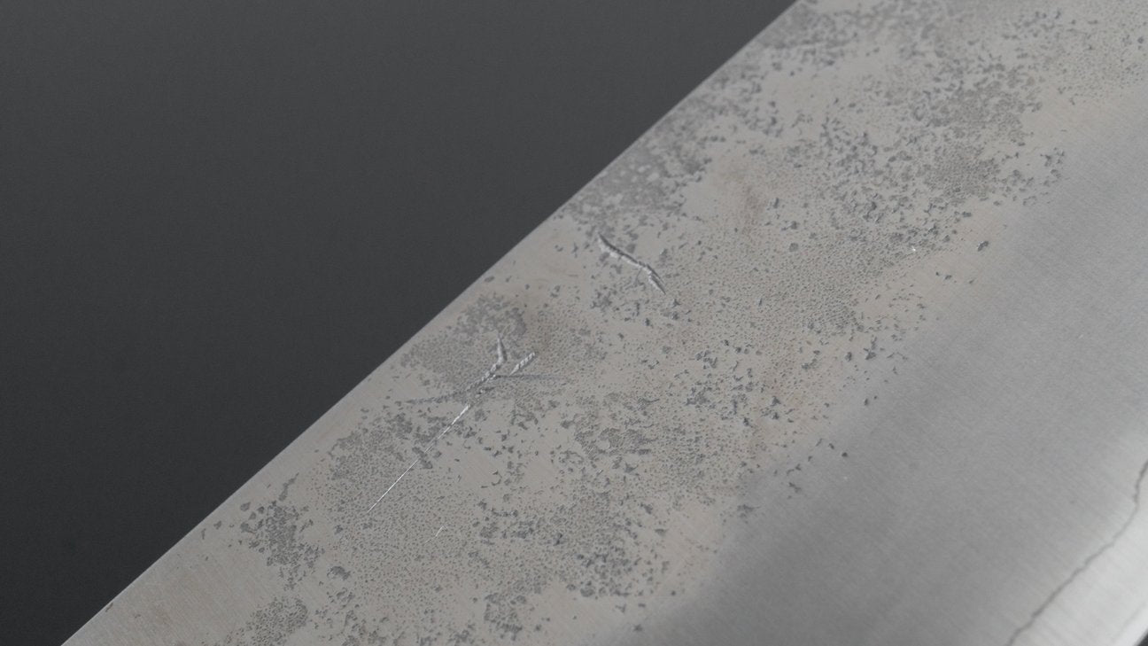 This is a stainless steel knife. Stainless steel gets its name from the inclusion of chromium (10-13%) in the alloy, which forms a protective film that helps prevent rust and corrosion by acting as a barrier between the metal and oxygen. While stainless steel knives are practical, functional, and easier to maintain than carbon steel, they are not completely maintenance-free. With improper care, they can still rust or develop pitting—after all, "stainless" does not mean "stain-free."