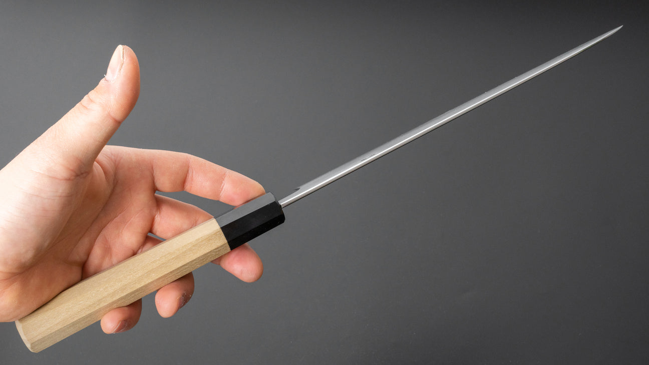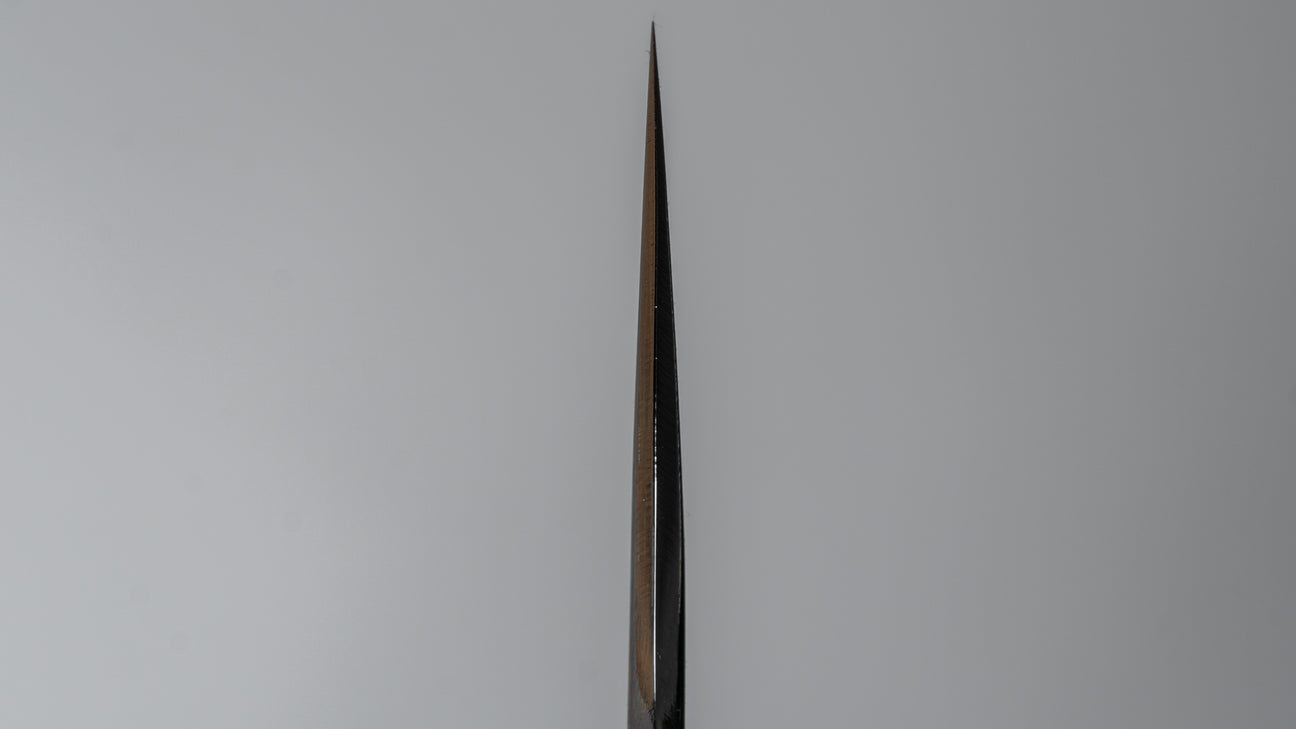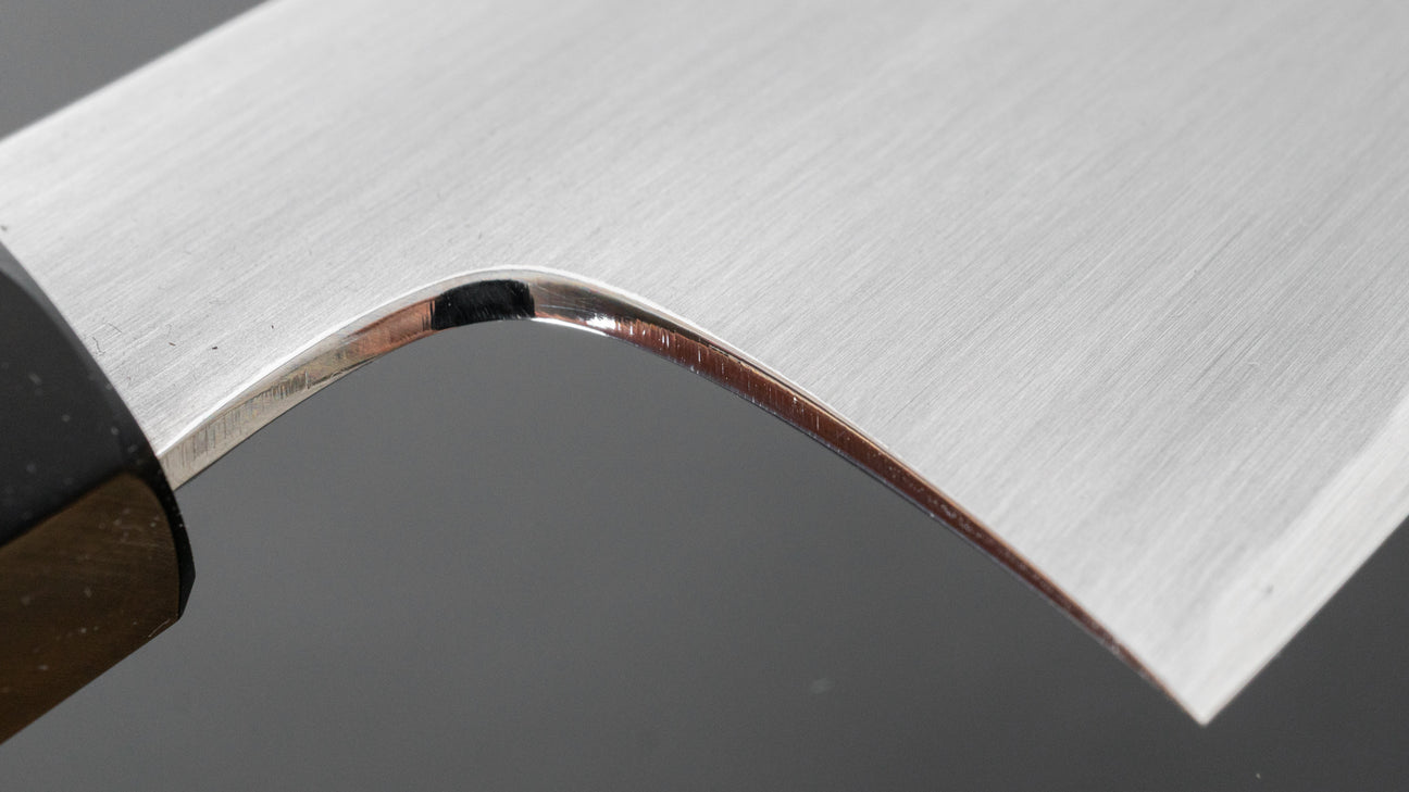 Gorobei’s fine hand forged carbon steels, shaped and sharpened by Rikichi, form solid blades with a more pronounced convex grind but still nice and thin behind the edge. A more substantial spine combined with some height give these knives a sturdy and reliable feel. Knives in white #2 sport a ho wood handle and weigh slightly less than the more hefty blue #2 knives which also come with the classic ho wood handles. Both feature a kasumi finished soft iron cladding with handle to tip polishing and have a chamfered spine and choil.