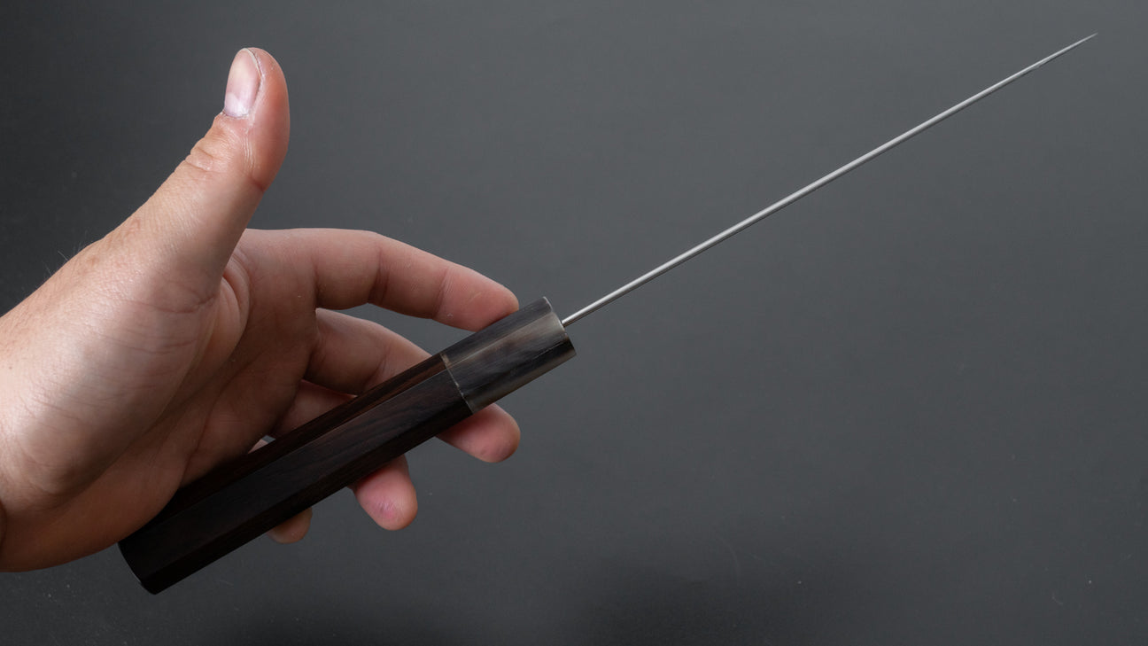 The Santoku is every bit as versatile as a Gyuto, but it’s more at home in everyday cooking. Probably the most used to-go knife at home. It’s easy to handle, super nimble, and great for just about any kitchen task.