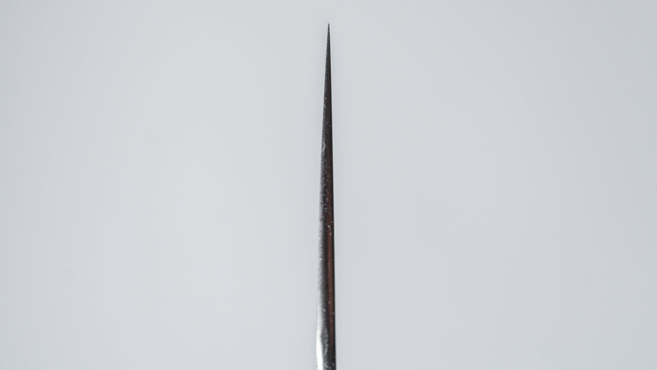 This is a carbon steel knife. Carbon steel is a non-stainless steel that lacks sufficient chromium and/or nickel to protect it from oxidation. As a result, it reacts to moisture and oxygen. While this may sound like a downside, it’s actually a key feature. Carbon steel forms a unique patina over time, is easy to sharpen, and offers excellent edge retention.