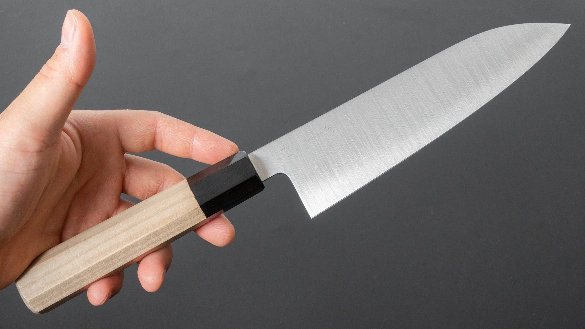The Santoku is every bit as versatile as a Gyuto, but it’s more at home in everyday cooking. Probably the most used to-go knife at home. It’s easy to handle, super nimble, and great for just about any kitchen task.