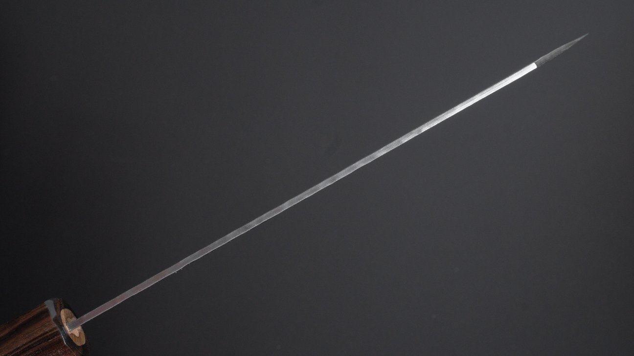 The Santoku is every bit as versatile as a Gyuto, but it’s more at home in everyday cooking. Probably the most used to-go knife at home. It’s easy to handle, super nimble, and great for just about any kitchen task.