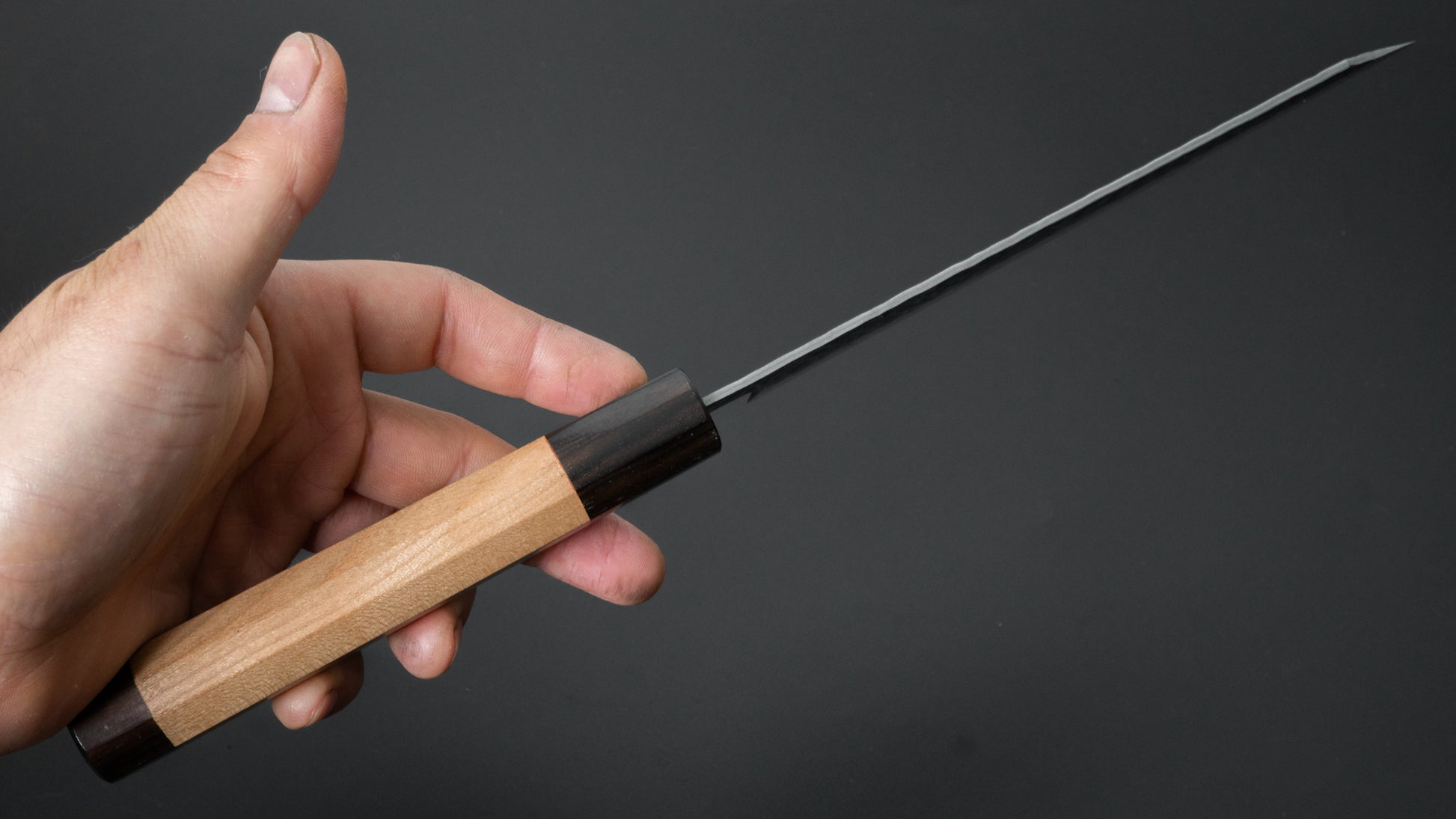 The Santoku is every bit as versatile as a Gyuto, but it’s more at home in everyday cooking. Probably the most used to-go knife at home. It’s easy to handle, super nimble, and great for just about any kitchen task.