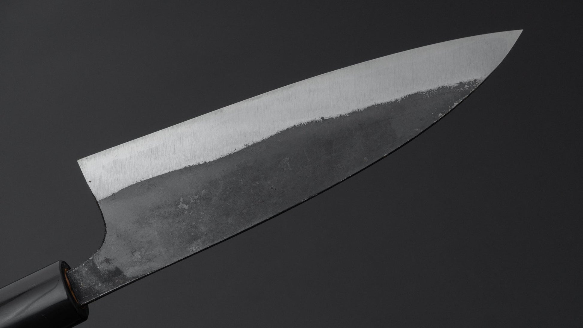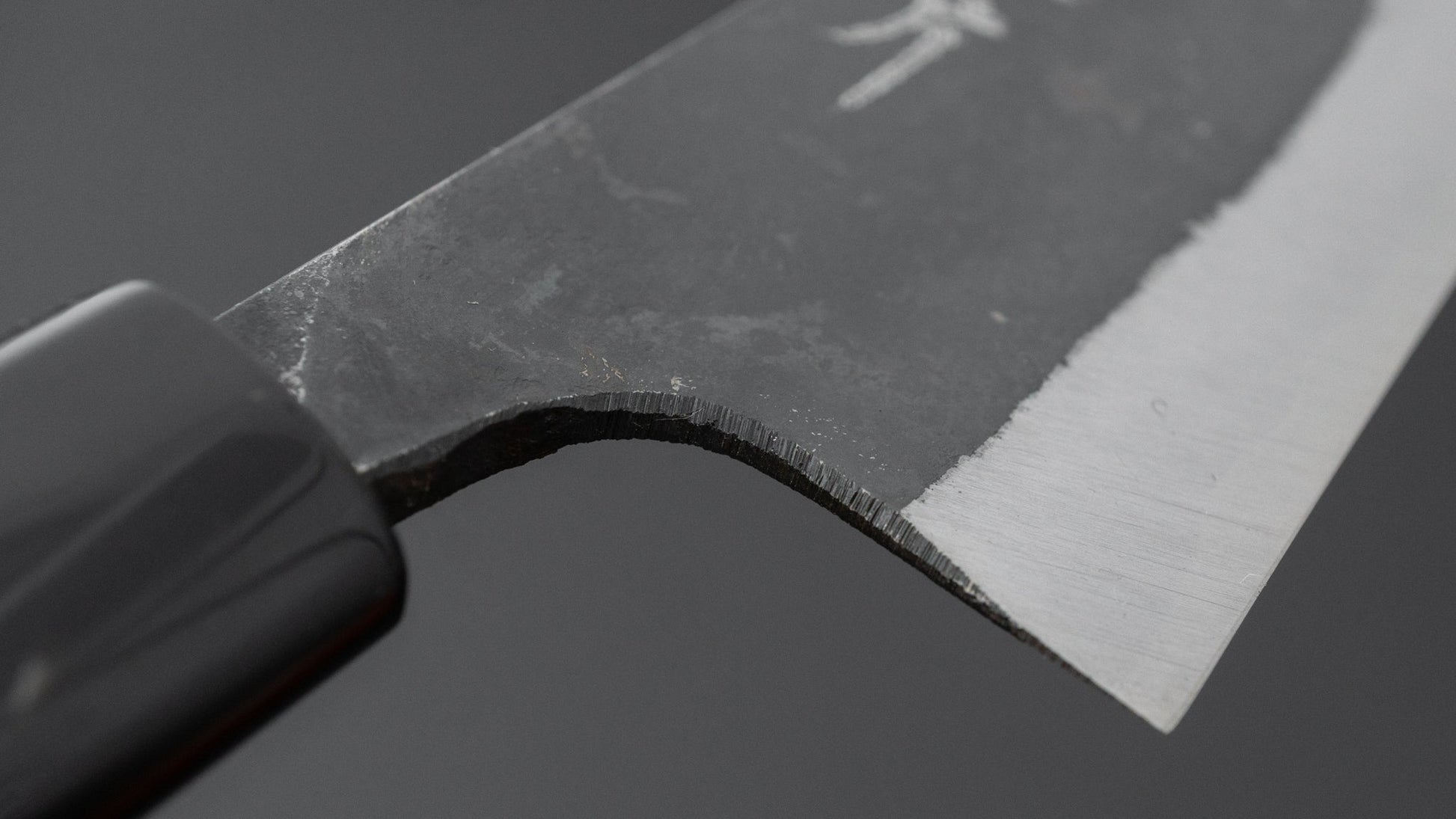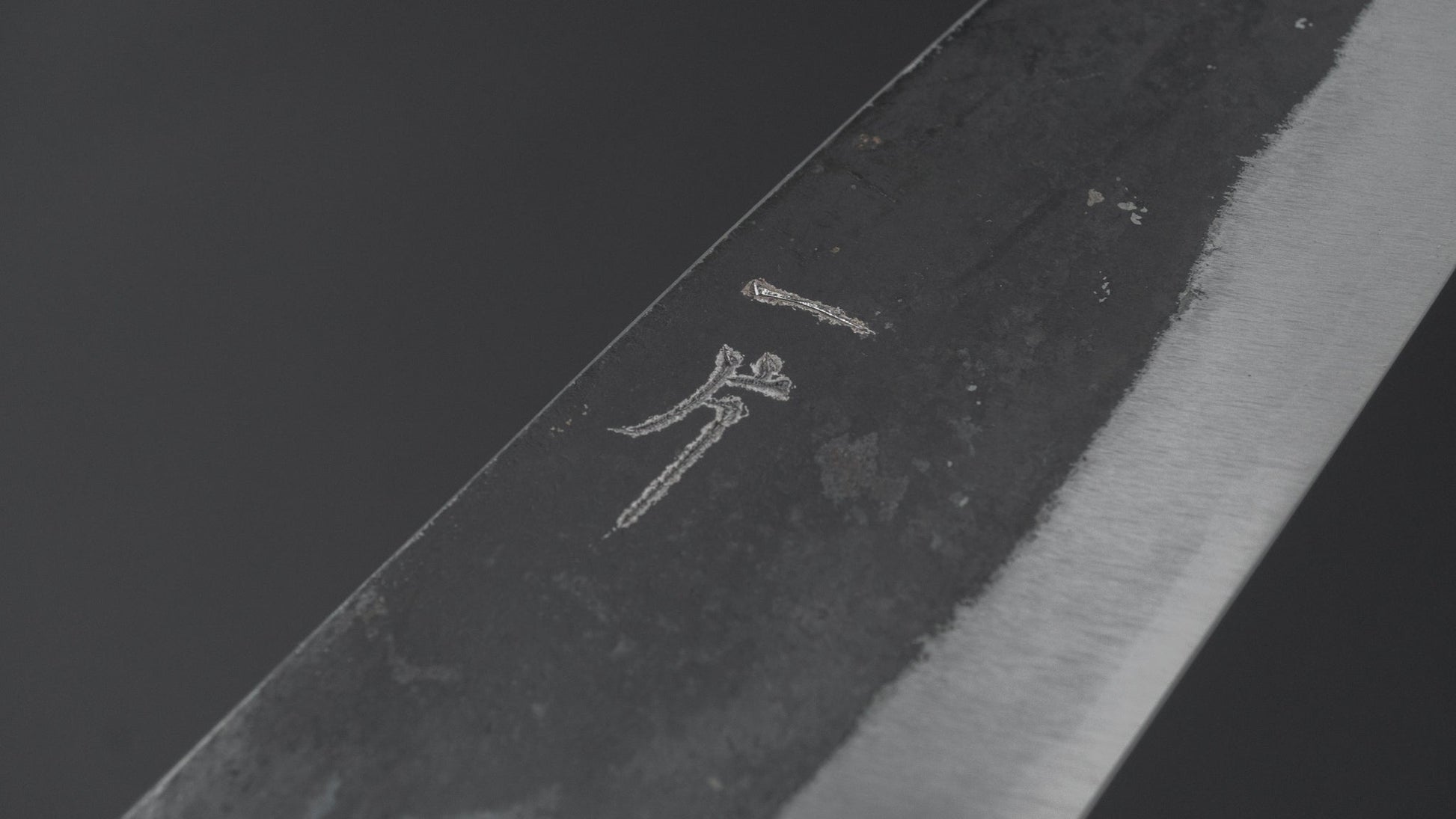 This is a carbon steel knife with a soft stainless steel cladding. Many Japanese knives are constructed with a 3-layer design known as “San Mai,” where a hard, high-quality steel core is sandwiched between two layers of softer steel or iron. In this case, the core is made of carbon steel, while the outer layers, or cladding, are composed of stainless steel. This construction combines the benefits of a carbon steel edge, such as easy sharpening and excellent edge retention, with the added corrosion resistance of stainless steel for the rest of the blade.