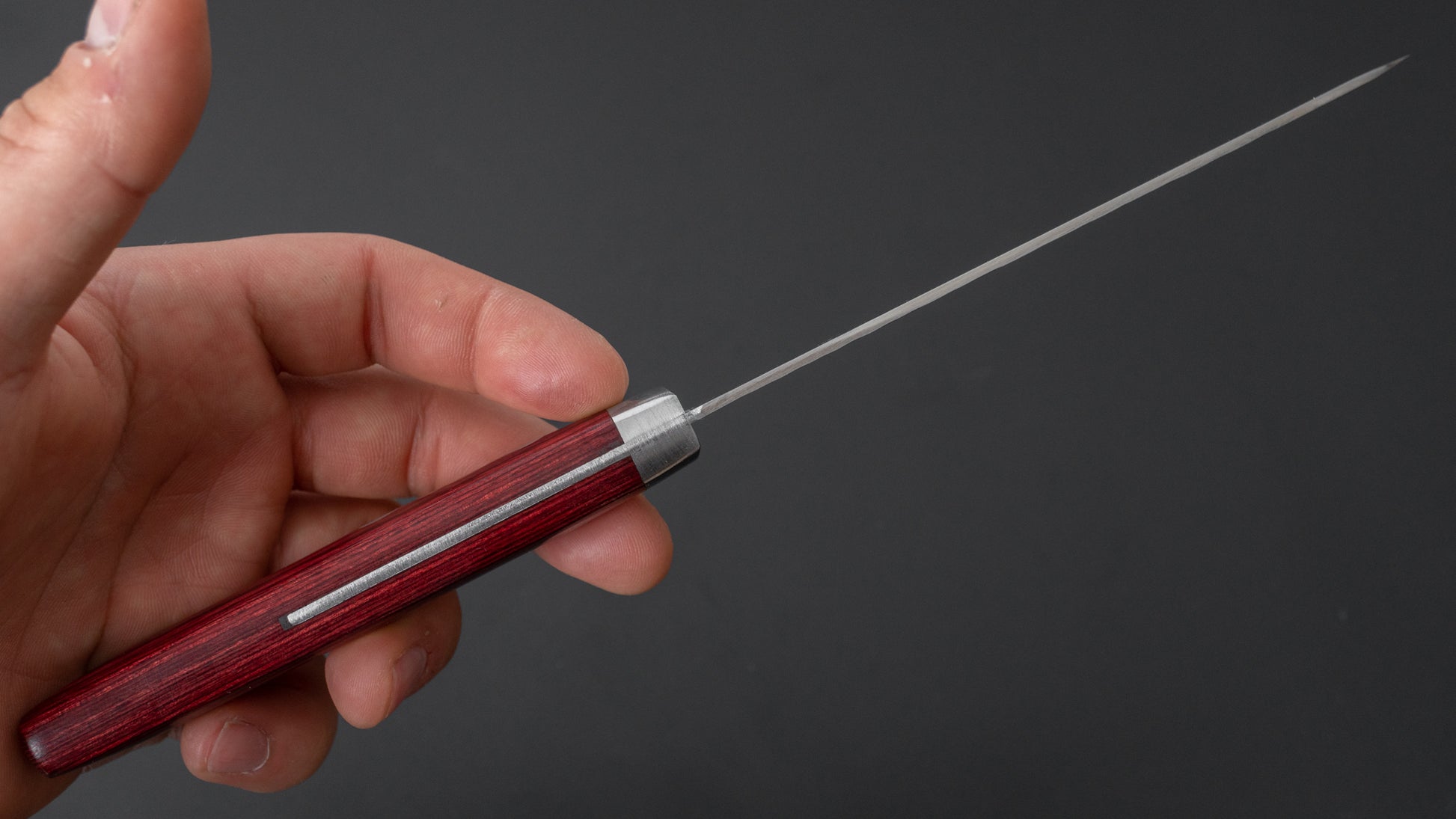 The Santoku is every bit as versatile as a Gyuto, but it’s more at home in everyday cooking. Probably the most used to-go knife at home. It’s easy to handle, super nimble, and great for just about any kitchen task.