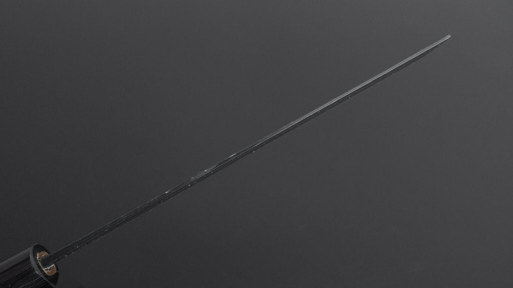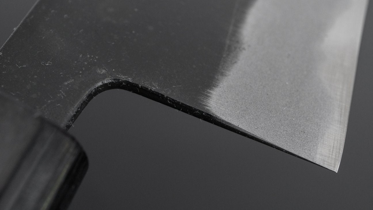 This is a carbon steel knife. Carbon steel is a non-stainless steel that lacks sufficient chromium and/or nickel to protect it from oxidation. As a result, it reacts to moisture and oxygen. While this may sound like a downside, it’s actually a key feature. Carbon steel forms a unique patina over time, is easy to sharpen, and offers excellent edge retention.