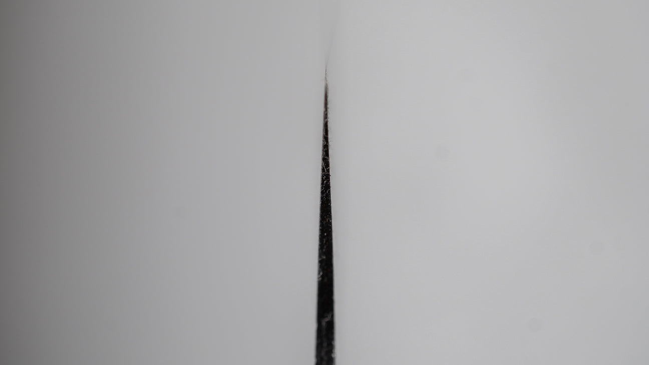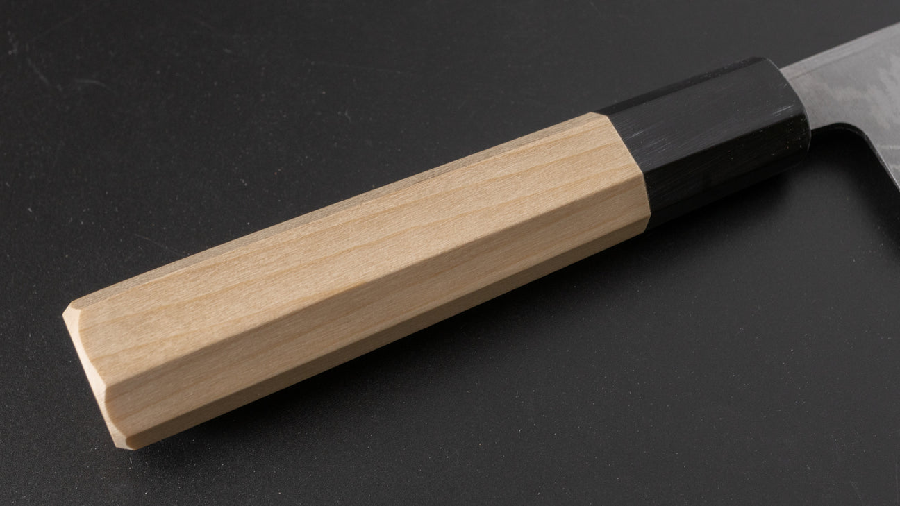 Hitohira GR knives are hand-forged in Echizen, Fukui prefecture, from carbon cladded blue #2. The grind is very thin, with relatively flat bevels with more rounded shinogi lines. Premium cutting performance and very easy to sharpen. The edge formation is very good and these can be sharpened to a wide variety of finishes. The cladding consists of multiple layered mild carbon steel creating beautiful contrast on the blade. We carry this line with classic Magnolia (Ho) wood or Rosewood. The restock time of this line is relatively slow, expected every three to four months.