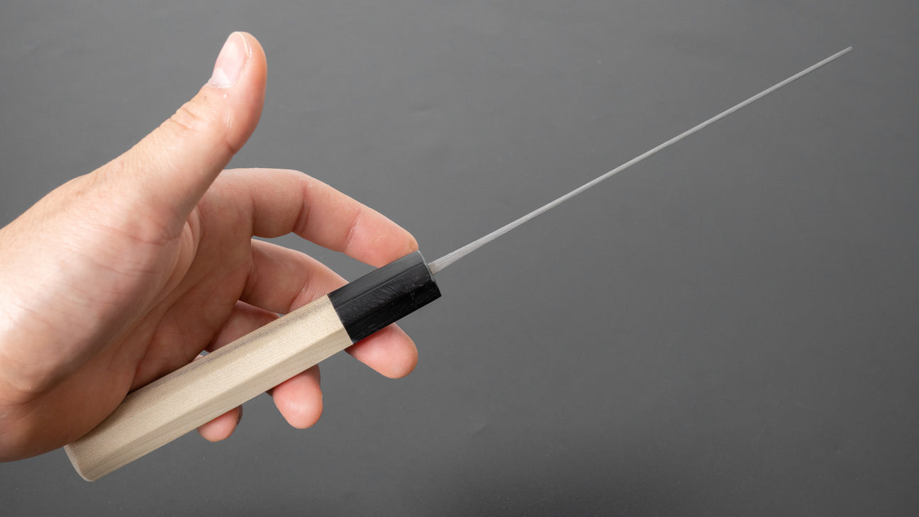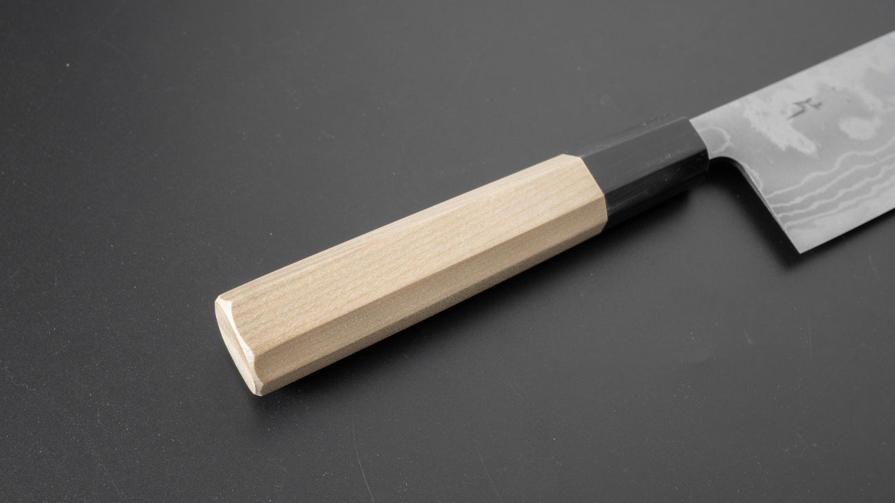 Hitohira GR knives are hand-forged in Echizen, Fukui prefecture, from carbon cladded blue #2. The grind is very thin, with relatively flat bevels with more rounded shinogi lines. Premium cutting performance and very easy to sharpen. The edge formation is very good and these can be sharpened to a wide variety of finishes. The cladding consists of multiple layered mild carbon steel creating beautiful contrast on the blade. We carry this line with classic Magnolia (Ho) wood or Rosewood. The restock time of this line is relatively slow, expected every three to four months.