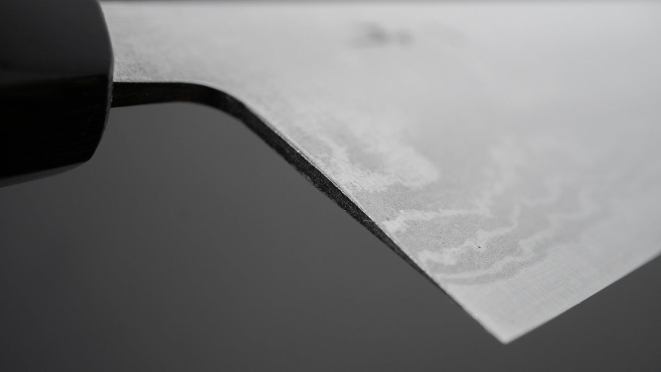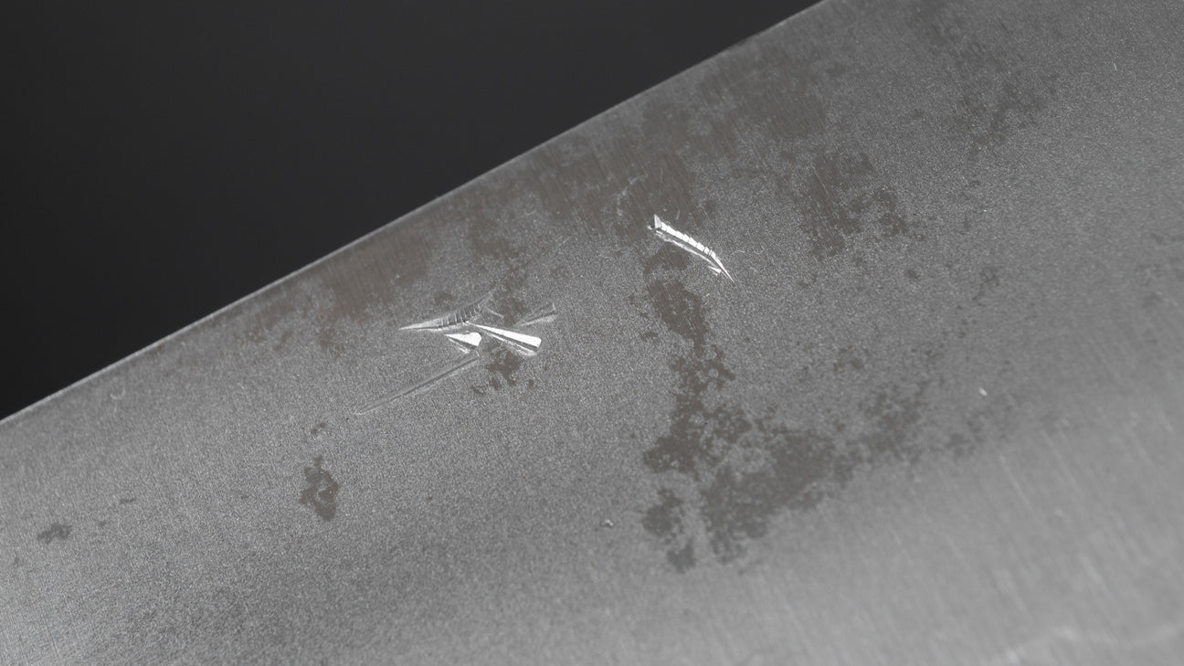 This is a carbon steel knife. Carbon steel is a non-stainless steel that lacks sufficient chromium and/or nickel to protect it from oxidation. As a result, it reacts to moisture and oxygen. While this may sound like a downside, it’s actually a key feature. Carbon steel forms a unique patina over time, is easy to sharpen, and offers excellent edge retention.