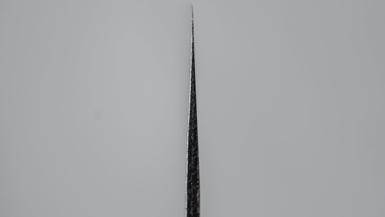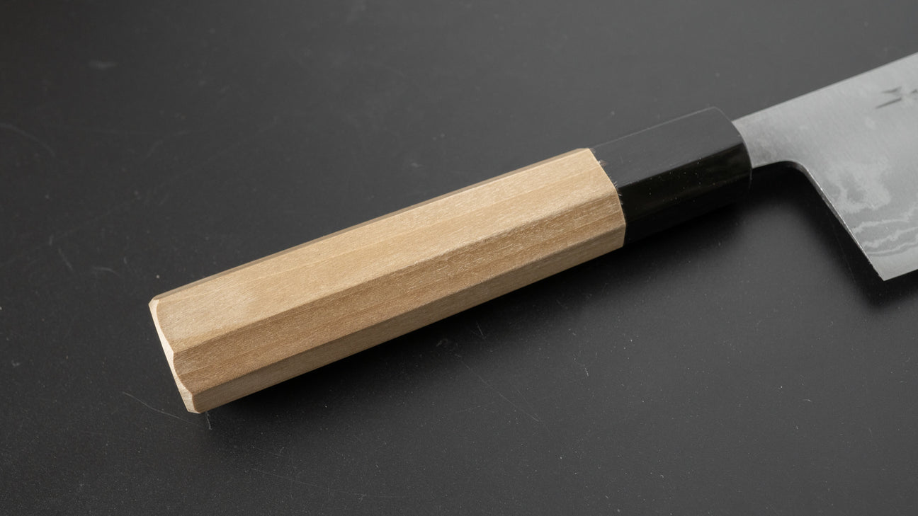 Hitohira GR knives are hand-forged in Echizen, Fukui prefecture, from carbon cladded blue #2. The grind is very thin, with relatively flat bevels with more rounded shinogi lines. Premium cutting performance and very easy to sharpen. The edge formation is very good and these can be sharpened to a wide variety of finishes. The cladding consists of multiple layered mild carbon steel creating beautiful contrast on the blade. We carry this line with classic Magnolia (Ho) wood or Rosewood. The restock time of this line is relatively slow, expected every three to four months.