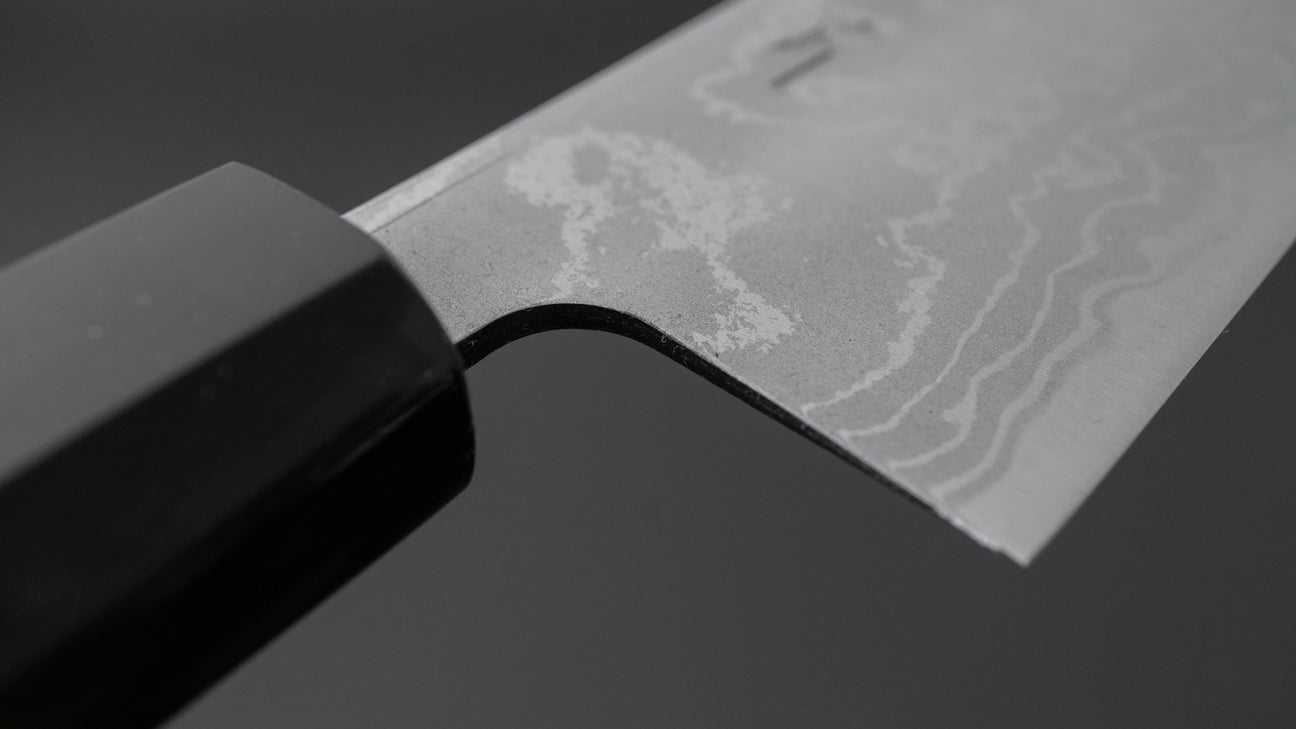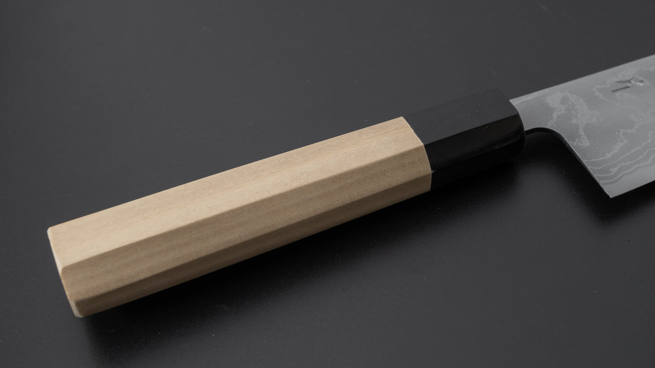 Hitohira GR knives are hand-forged in Echizen, Fukui prefecture, from carbon cladded blue #2. The grind is very thin, with relatively flat bevels with more rounded shinogi lines. Premium cutting performance and very easy to sharpen. The edge formation is very good and these can be sharpened to a wide variety of finishes. The cladding consists of multiple layered mild carbon steel creating beautiful contrast on the blade. We carry this line with classic Magnolia (Ho) wood or Rosewood. The restock time of this line is relatively slow, expected every three to four months.