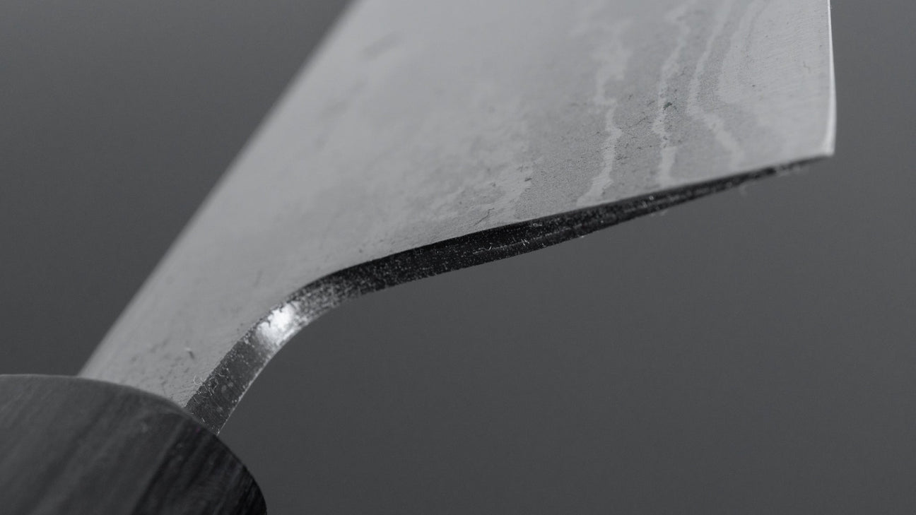Hitohira GR knives are hand-forged in Echizen, Fukui prefecture, from carbon cladded blue #2. The grind is very thin, with relatively flat bevels with more rounded shinogi lines. Premium cutting performance and very easy to sharpen. The edge formation is very good and these can be sharpened to a wide variety of finishes. The cladding consists of multiple layered mild carbon steel creating beautiful contrast on the blade. We carry this line with classic Magnolia (Ho) wood or Rosewood. The restock time of this line is relatively slow, expected every three to four months.