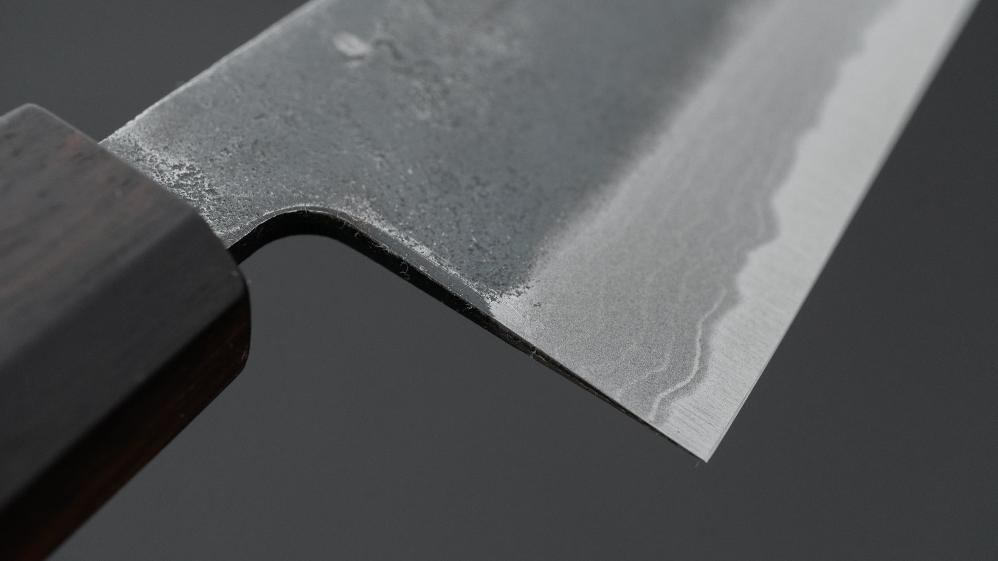 This is a carbon steel knife with a soft stainless steel cladding. Many Japanese knives are constructed with a 3-layer design known as “San Mai,” where a hard, high-quality steel core is sandwiched between two layers of softer steel or iron. In this case, the core is made of carbon steel, while the outer layers, or cladding, are composed of stainless steel. This construction combines the benefits of a carbon steel edge, such as easy sharpening and excellent edge retention, with the added corrosion resistance of stainless steel for the rest of the blade.