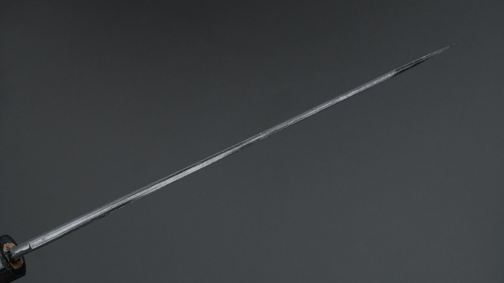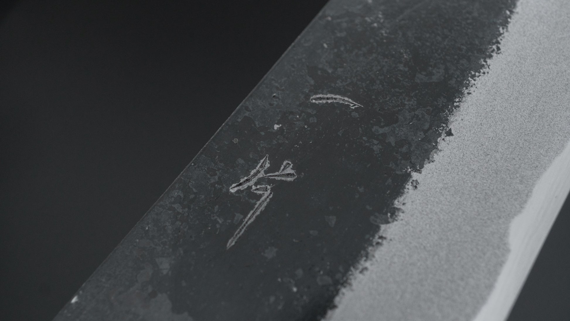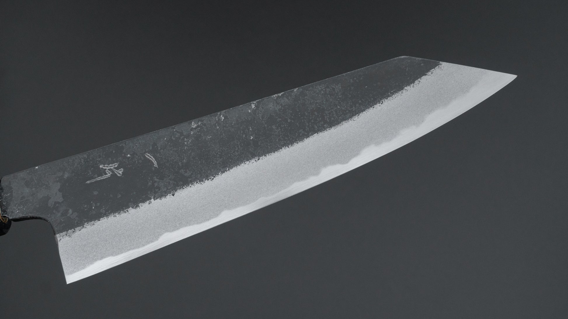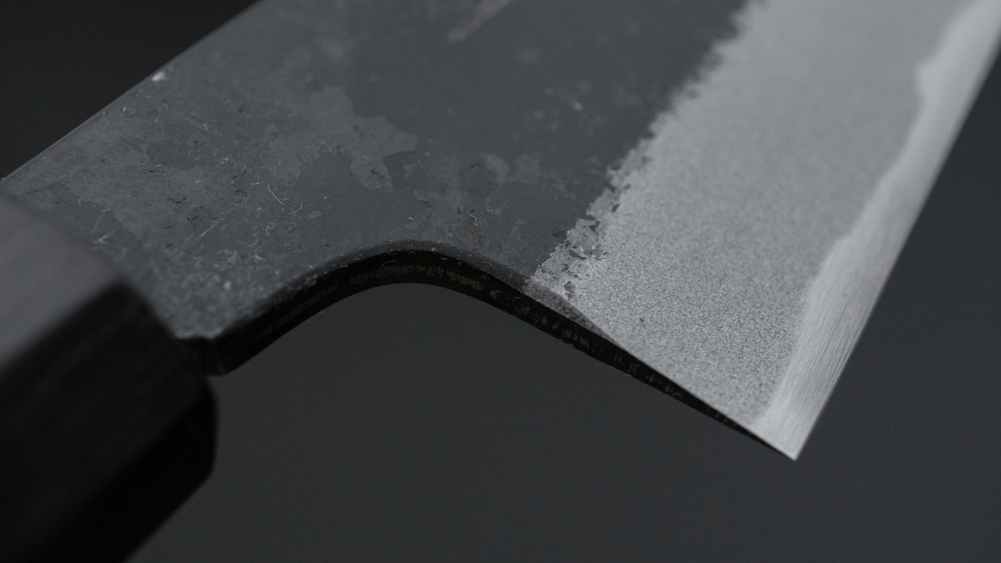 This is a carbon steel knife with a soft stainless steel cladding. Many Japanese knives are constructed with a 3-layer design known as “San Mai,” where a hard, high-quality steel core is sandwiched between two layers of softer steel or iron. In this case, the core is made of carbon steel, while the outer layers, or cladding, are composed of stainless steel. This construction combines the benefits of a carbon steel edge, such as easy sharpening and excellent edge retention, with the added corrosion resistance of stainless steel for the rest of the blade.