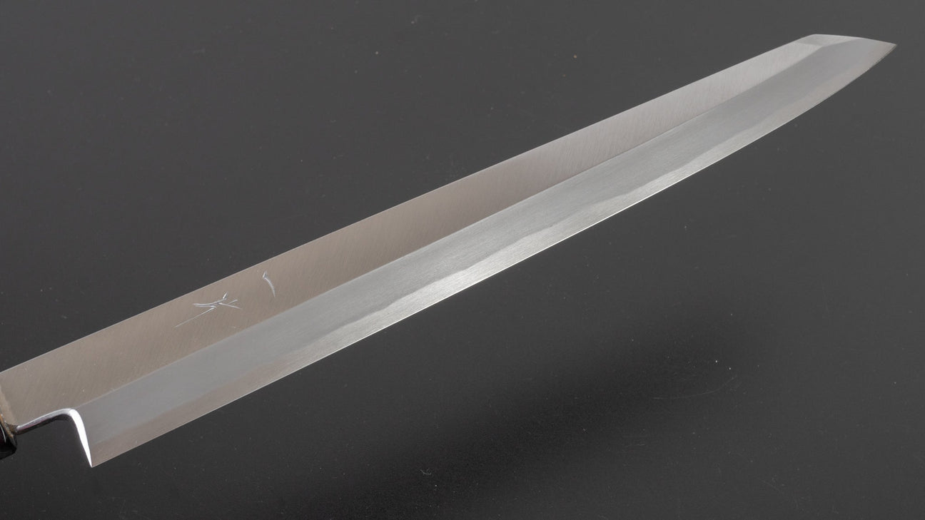 The traditional Japanese slicer. The king of knives and ofter referred to as ’Sushi knife’ it is used for slicing boneless protein. More specific and less versatile compared to the Sujihiki, the performance of the properly sharpened Yanagiba will yield much higher quality results due to their geometry and sharpness. Characteristics in steel are pronounced in single bevel knives and different sharpeners make for much variety.