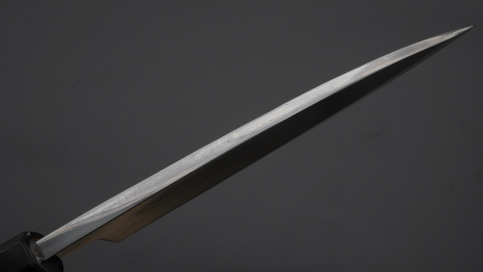 This is a carbon steel knife. Carbon steel is a non-stainless steel that lacks sufficient chromium and/or nickel to protect it from oxidation. As a result, it reacts to moisture and oxygen. While this may sound like a downside, it’s actually a key feature. Carbon steel forms a unique patina over time, is easy to sharpen, and offers excellent edge retention.