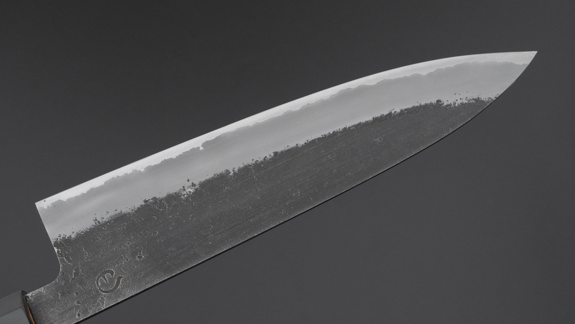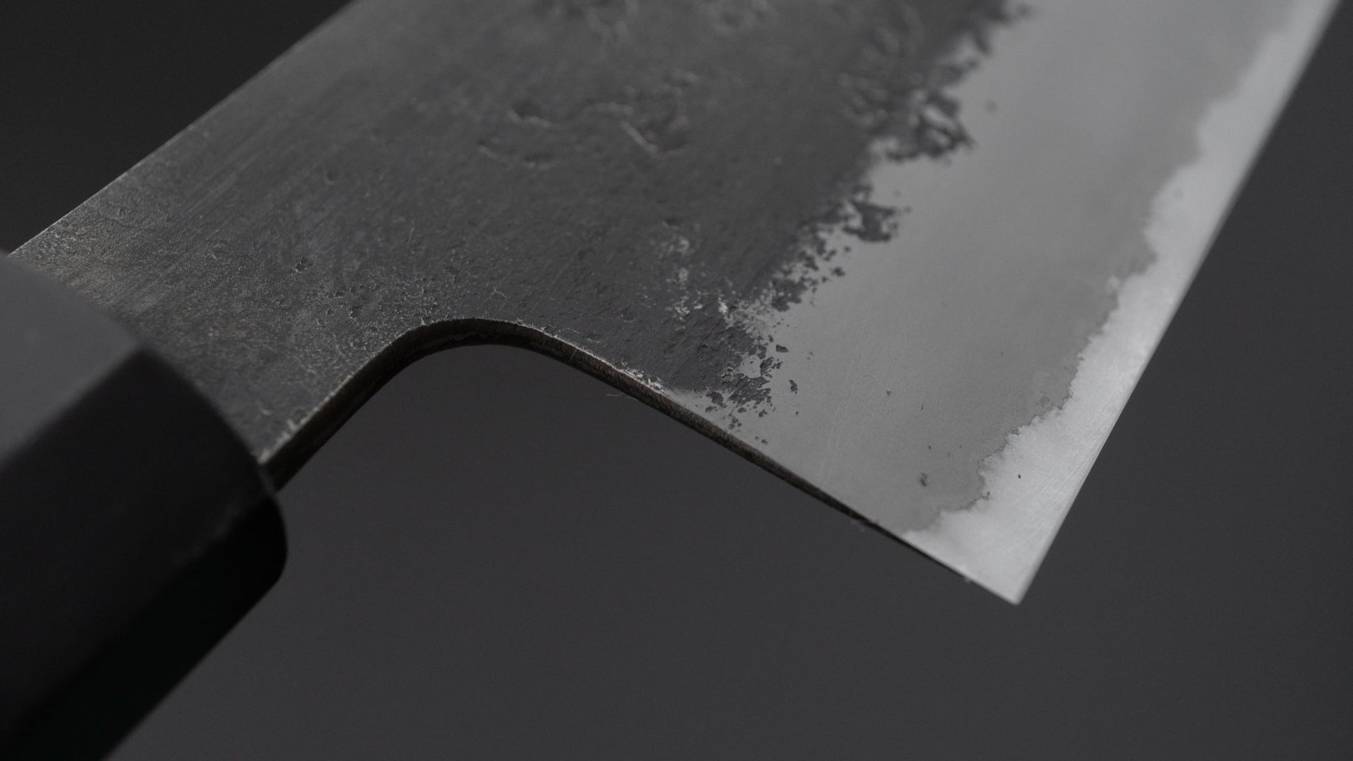 This is a carbon steel knife with a soft stainless steel cladding. Many Japanese knives are constructed with a 3-layer design known as “San Mai,” where a hard, high-quality steel core is sandwiched between two layers of softer steel or iron. In this case, the core is made of carbon steel, while the outer layers, or cladding, are composed of stainless steel. This construction combines the benefits of a carbon steel edge, such as easy sharpening and excellent edge retention, with the added corrosion resistance of stainless steel for the rest of the blade.