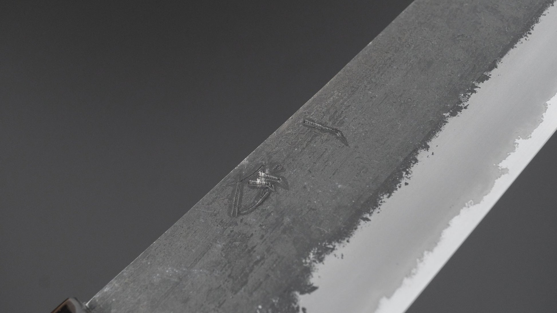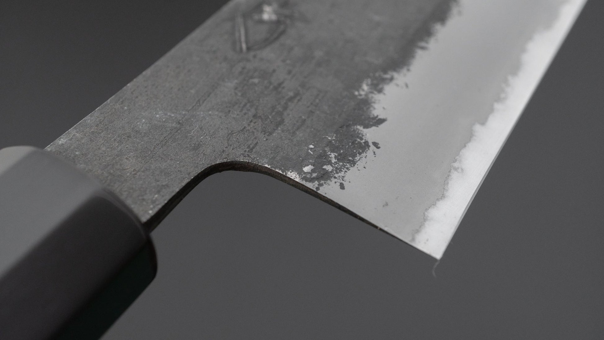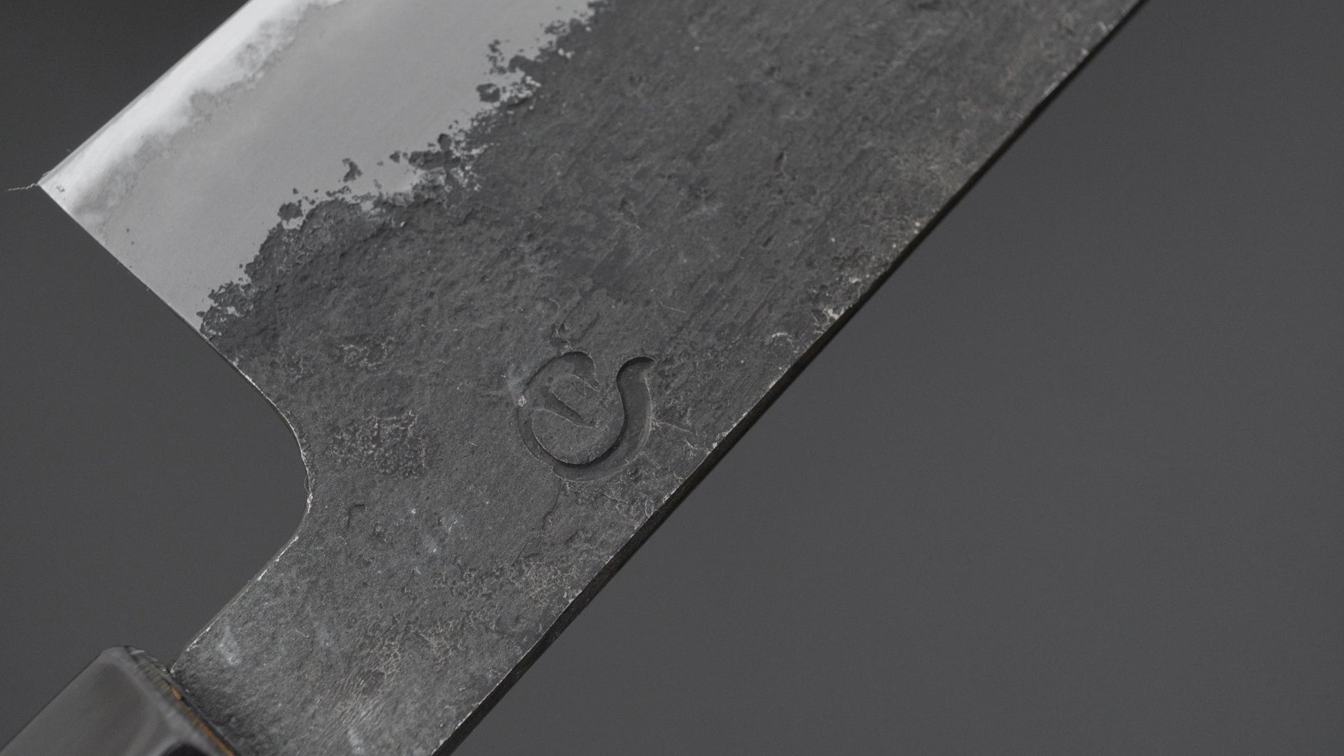 This is a carbon steel knife with a soft stainless steel cladding. Many Japanese knives are constructed with a 3-layer design known as “San Mai,” where a hard, high-quality steel core is sandwiched between two layers of softer steel or iron. In this case, the core is made of carbon steel, while the outer layers, or cladding, are composed of stainless steel. This construction combines the benefits of a carbon steel edge, such as easy sharpening and excellent edge retention, with the added corrosion resistance of stainless steel for the rest of the blade.